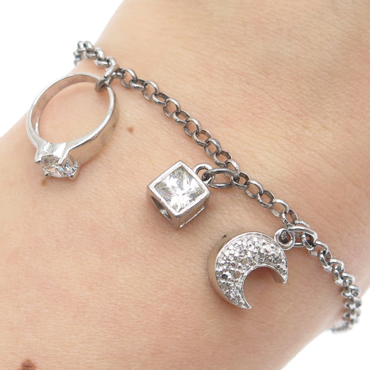 925 Sterling Silver 2-Tone Real Diamond Bangle Bracelet 6.25" (missing 1 stone)
