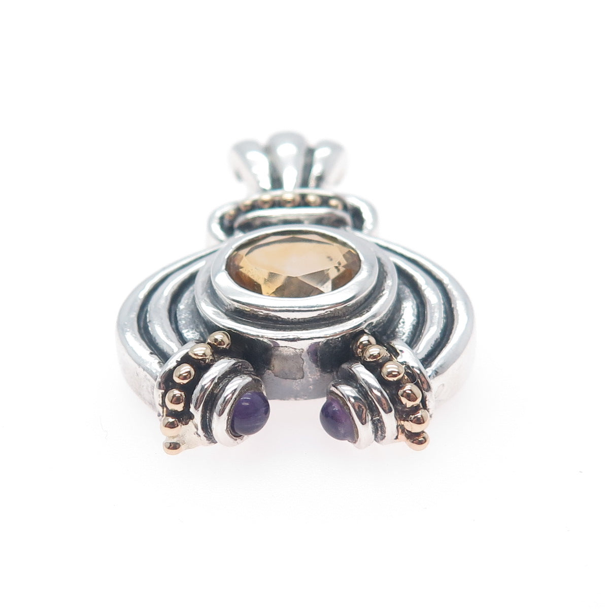 14K Gold 925 Sterling Silver Vintage Real Citrine & Amethyst Modernist Pendant