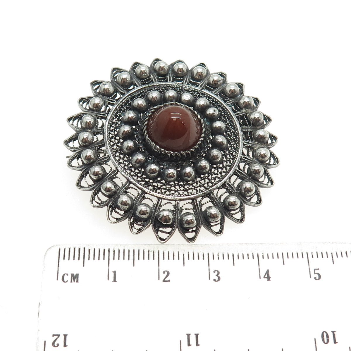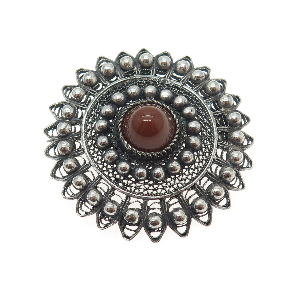800 Silver Antique Egypt Real Red Agate Gemstone Filigree Pin Brooch