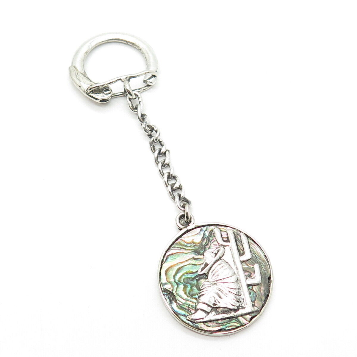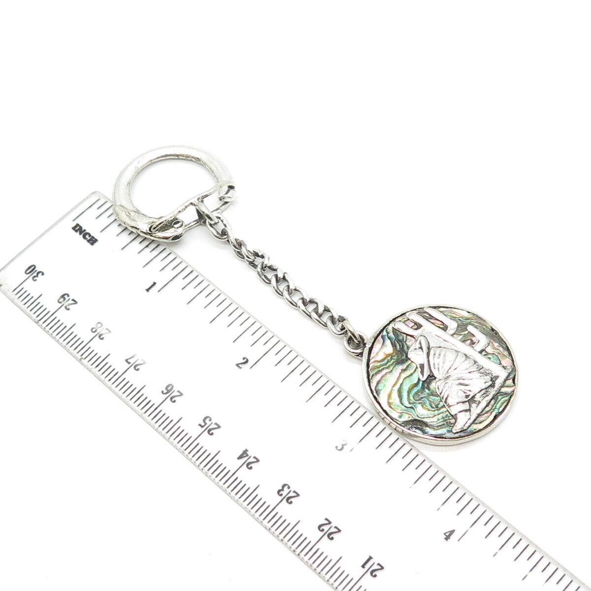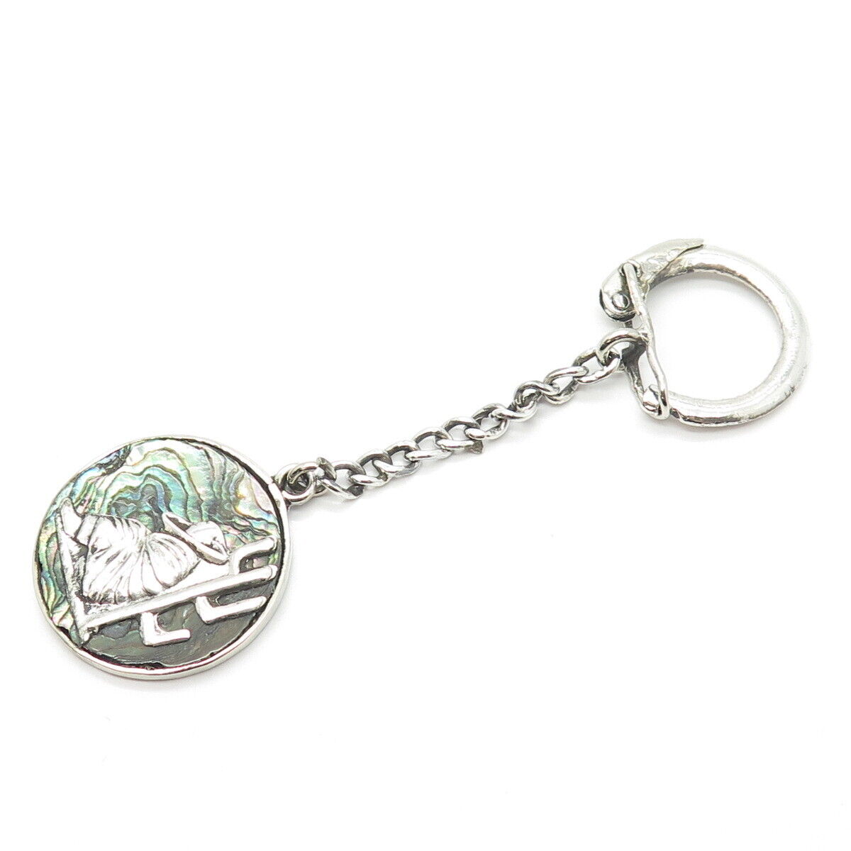 800 Silver Vintage Mexico Real Abalone Shell Wanderer Key Ring w/Chain