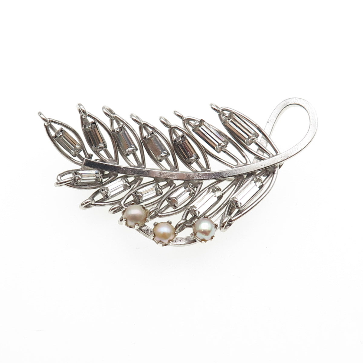925 Sterling Antique Art Deco Rhinestone Real Pearl Floral Pin Brooch / Pendant