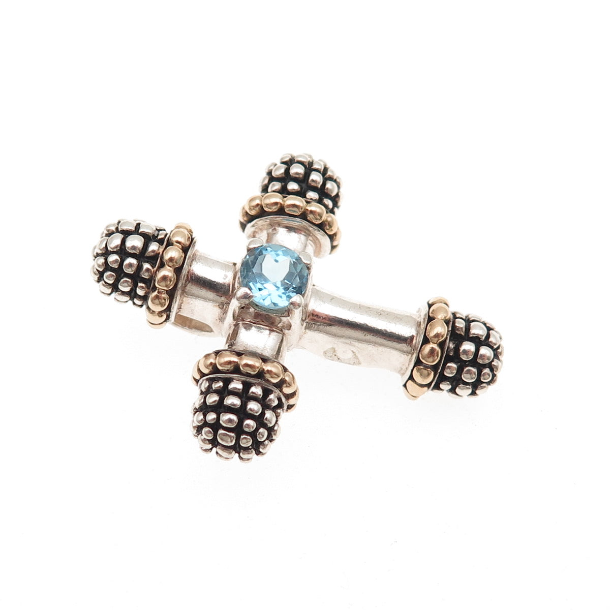 925 Sterling Silver 14K Gold Vintage Real Blue Topaz Cross Slide Pendant