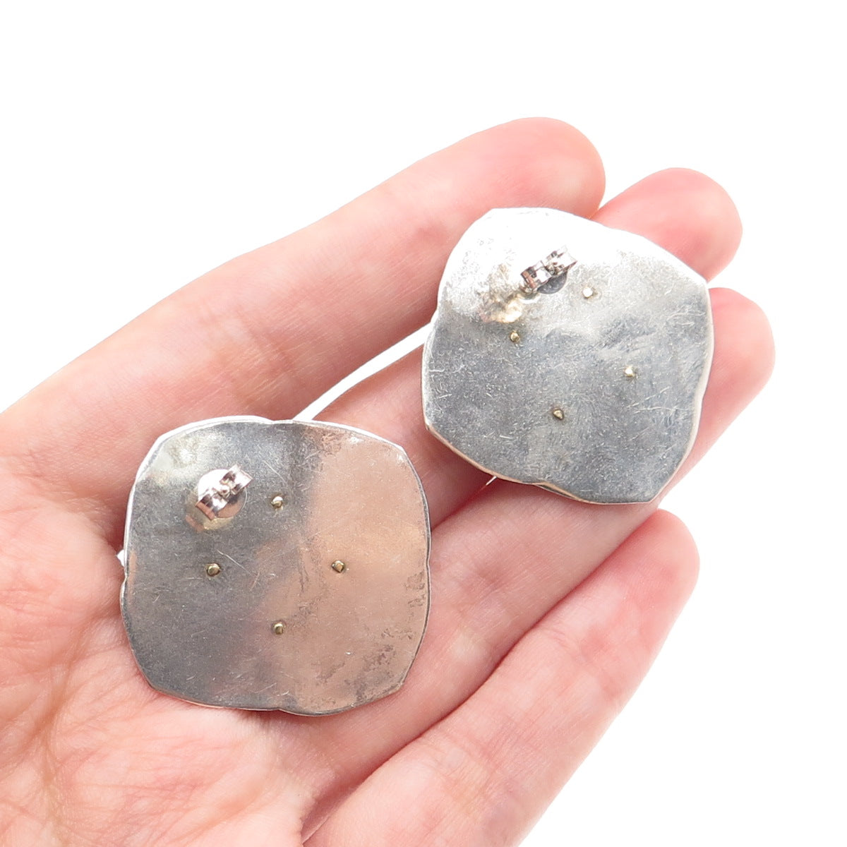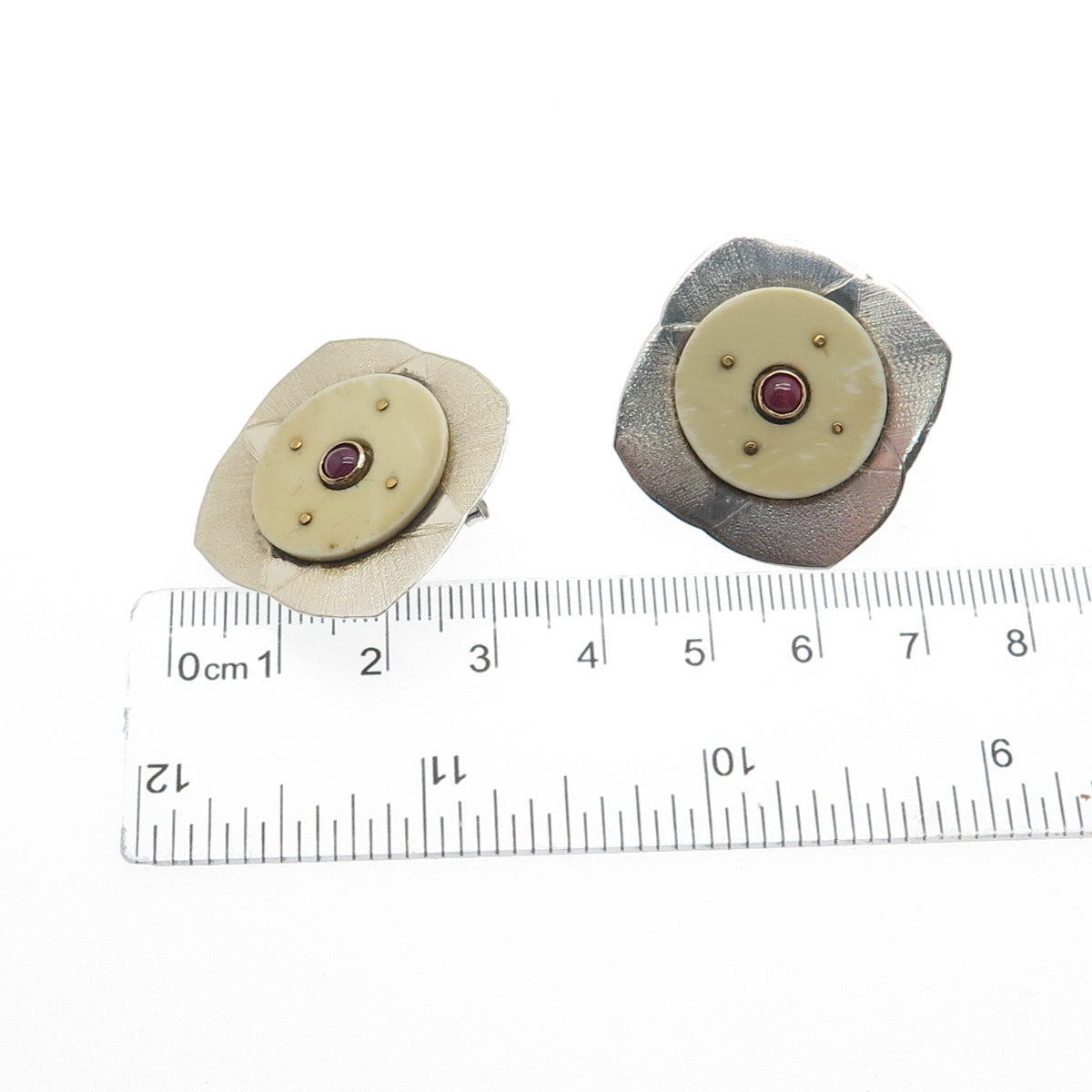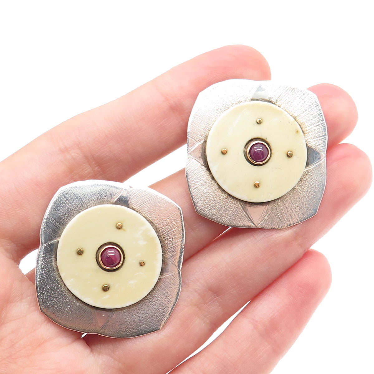 925 Sterling Silver & 14K Yellow Gold Vintage Real Ruby Modernist Earrings