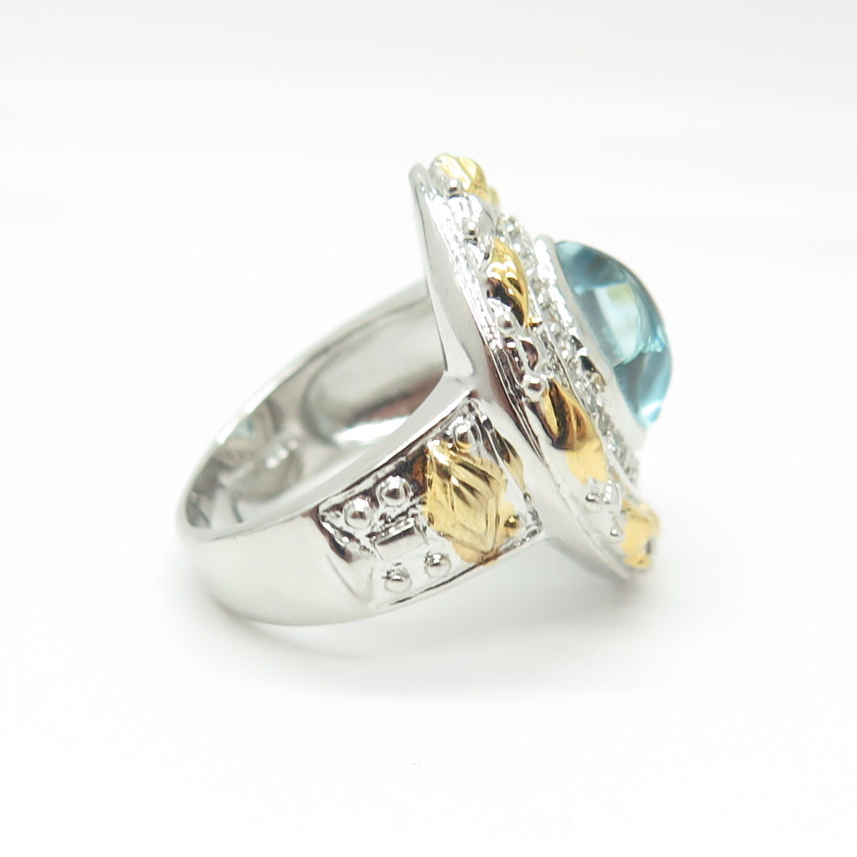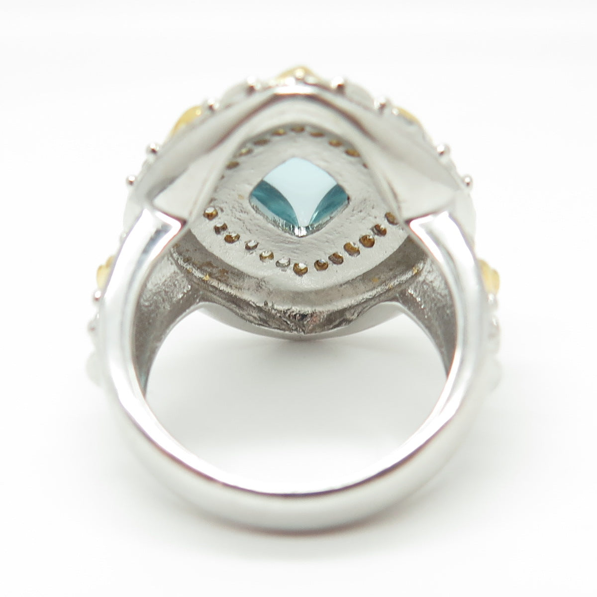 925 Sterling Silver 2-Tone Blue Glass & C Z Statement Ring Size 7
