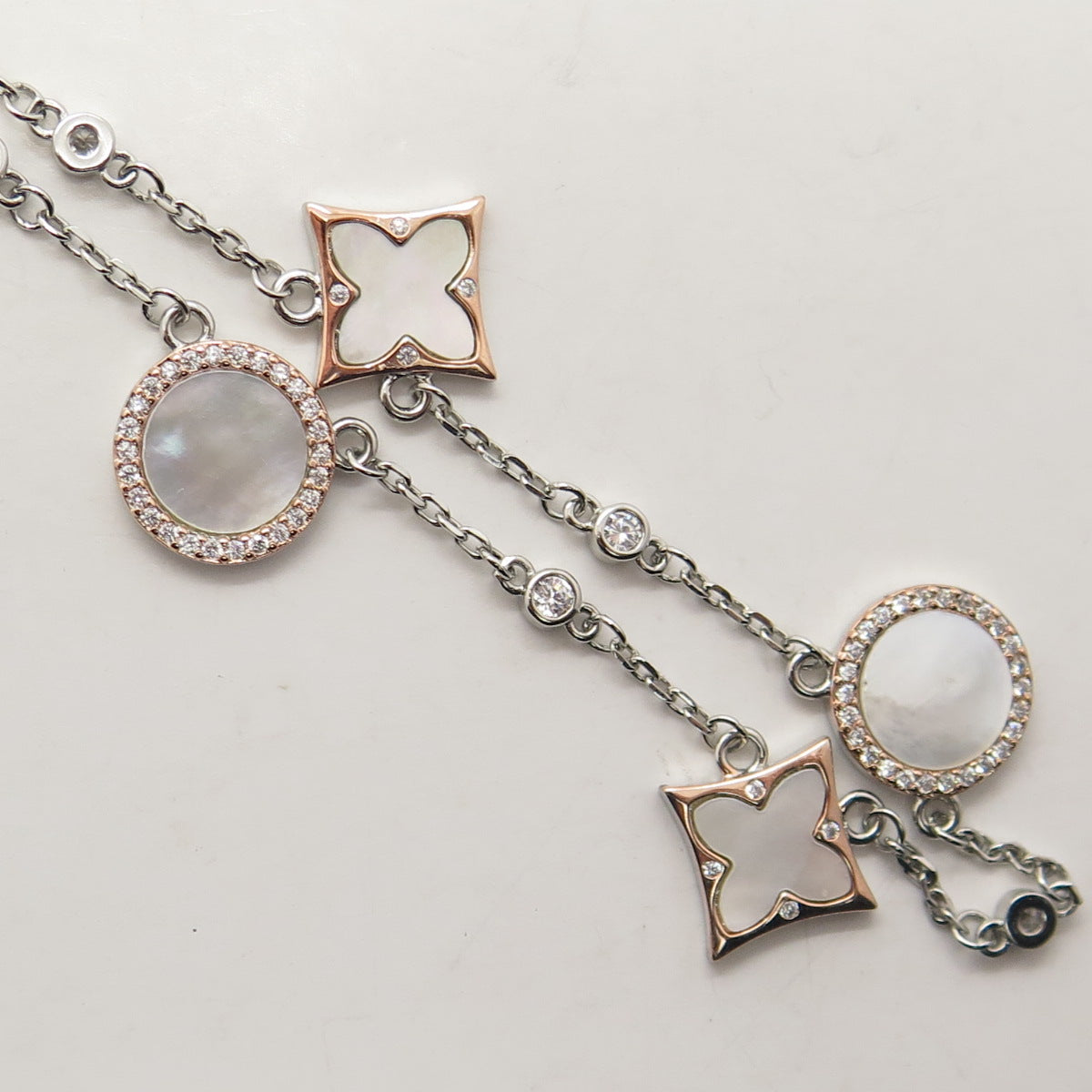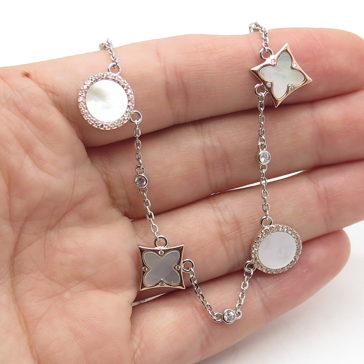 925 Sterling Silver 2-Tone Mother-of-Pearl & C Z Station Rolo Chain Necklace 18"
