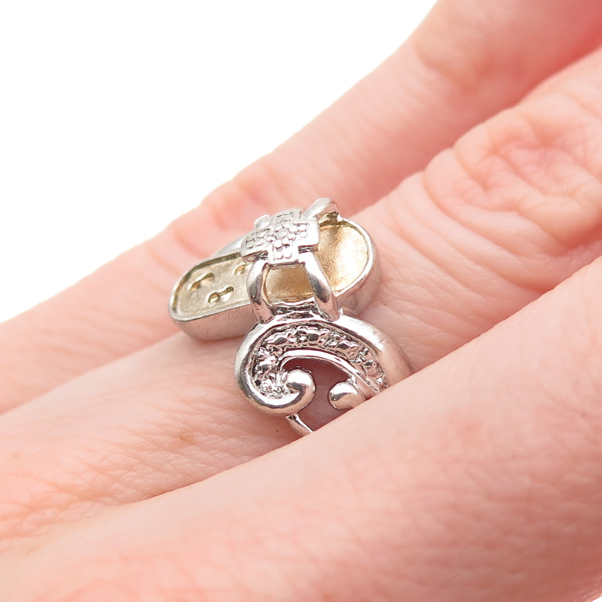 925 Sterling Silver 2-Tone Real Diamond Accent He Walks w/ Me Cross Ring Size 6