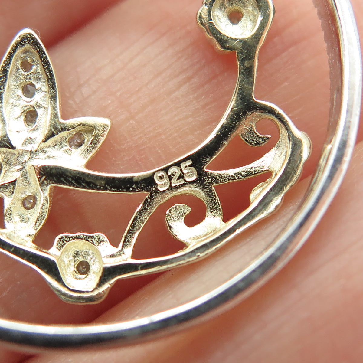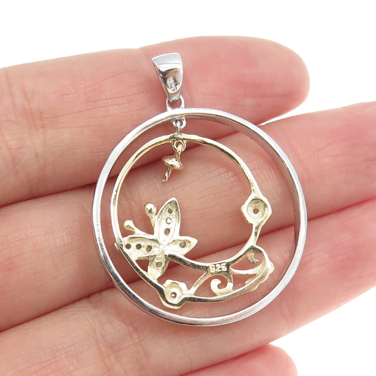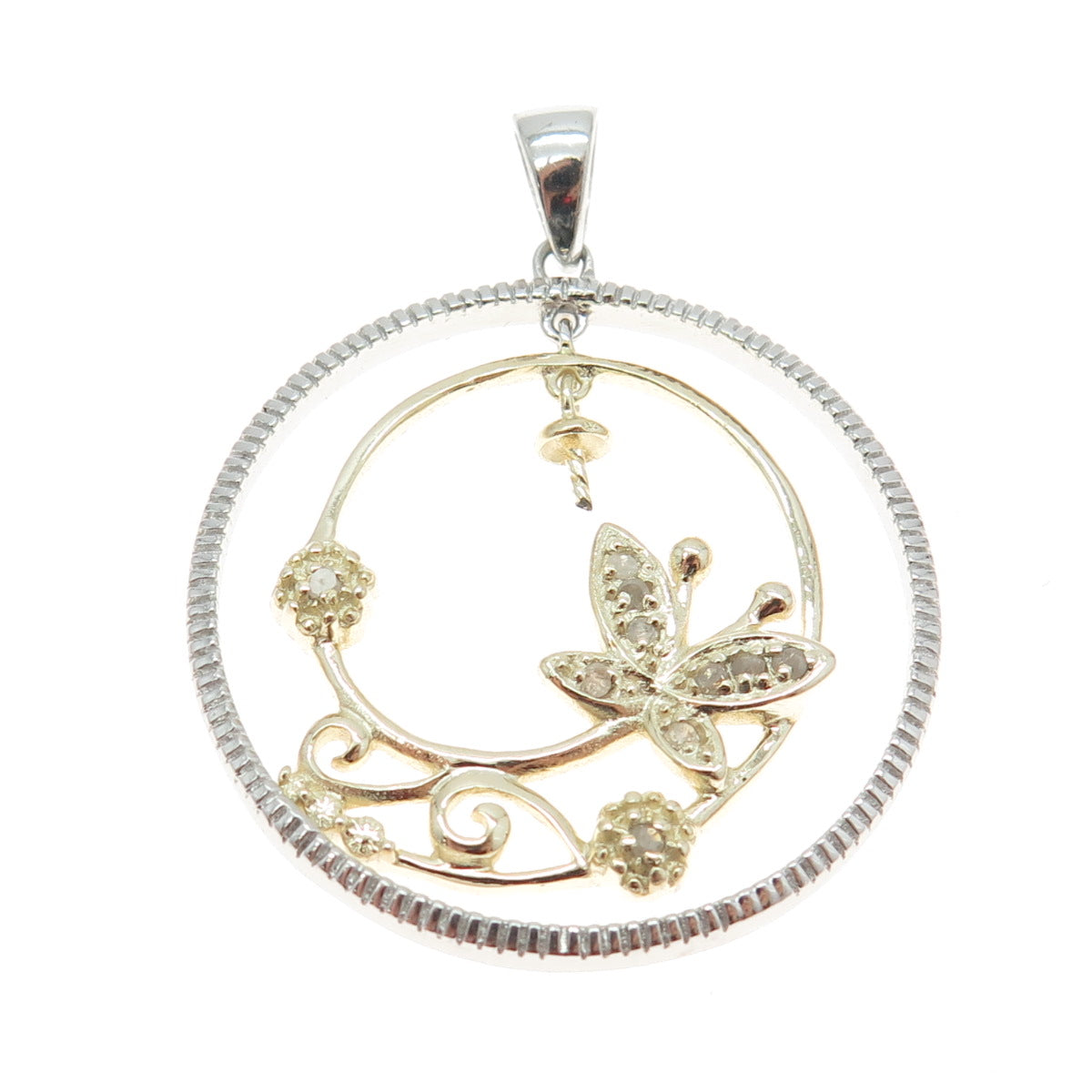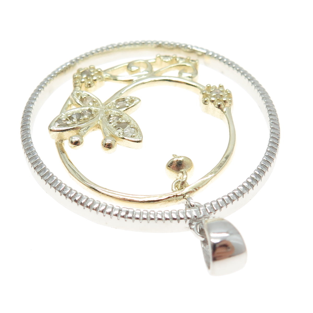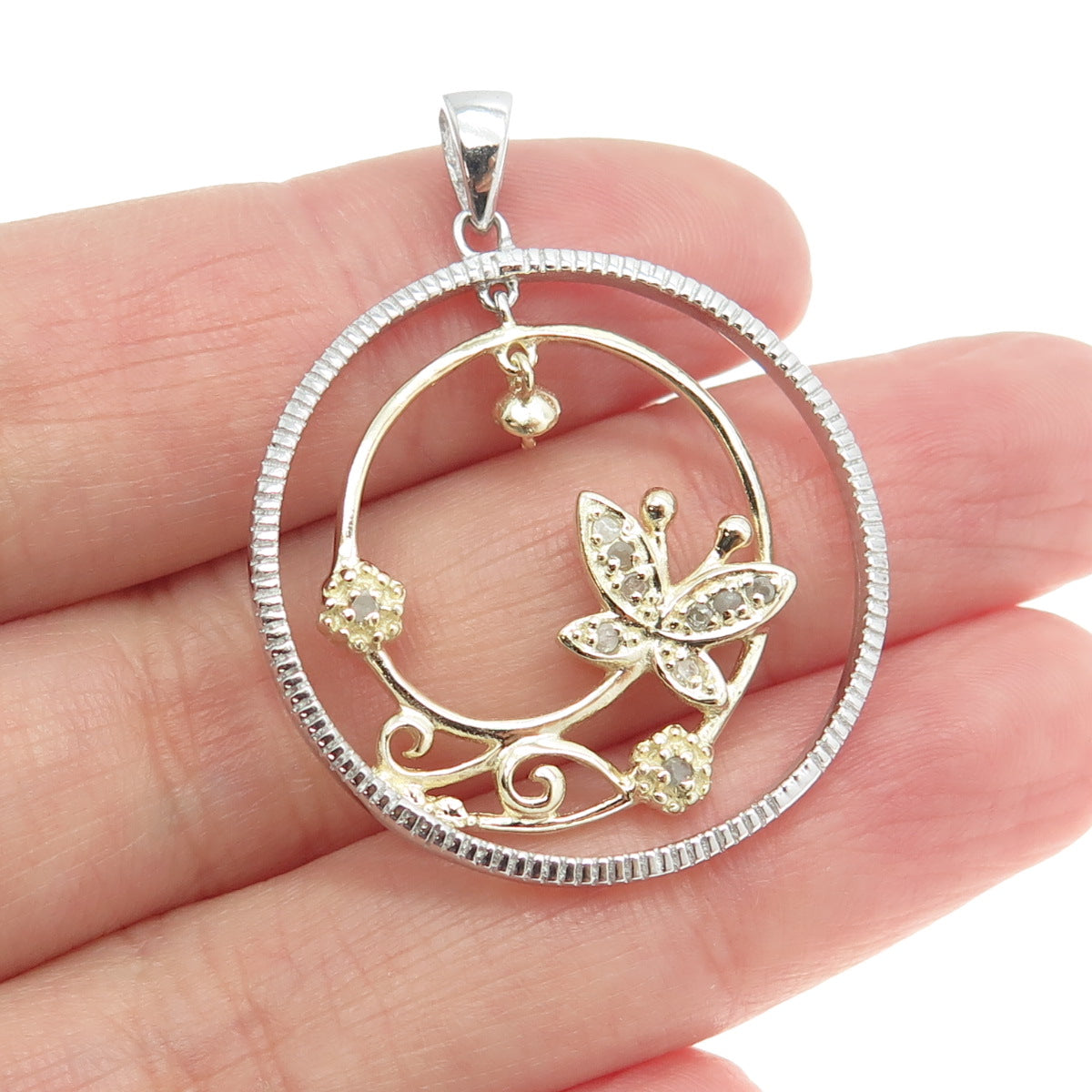 925 Sterling Silver 2-Tone Real Round-Cut Diamond Butterfly Round Pendant