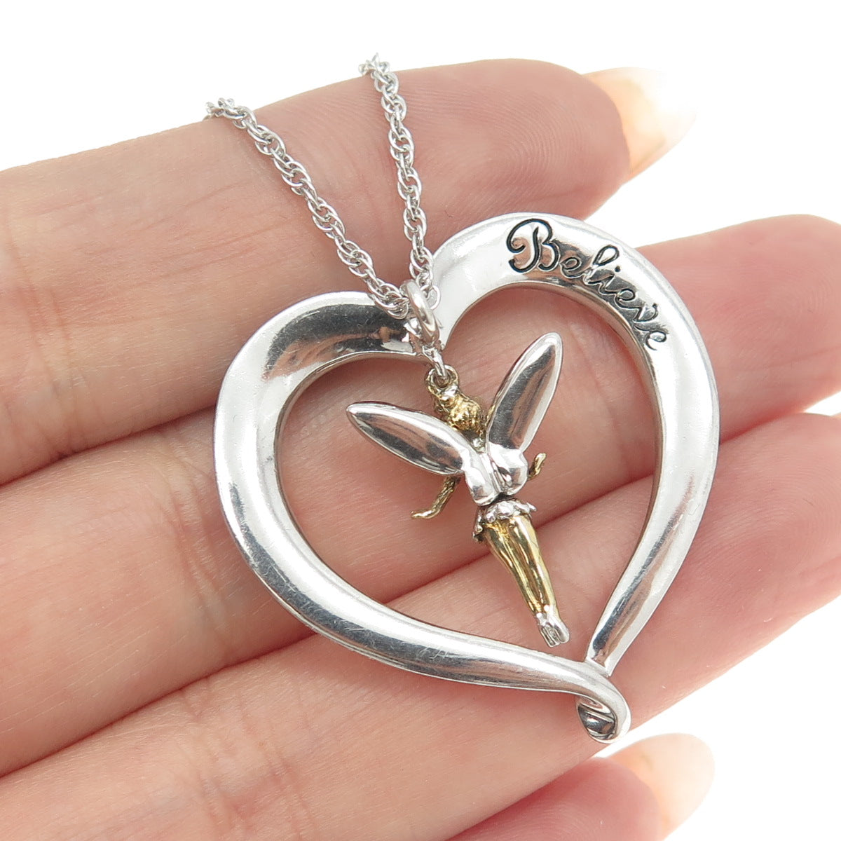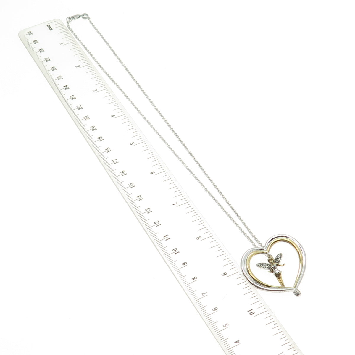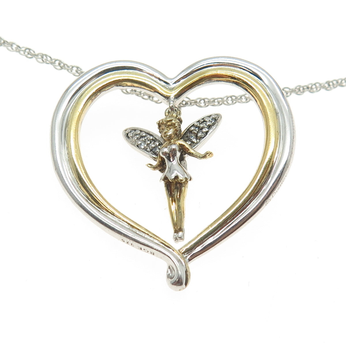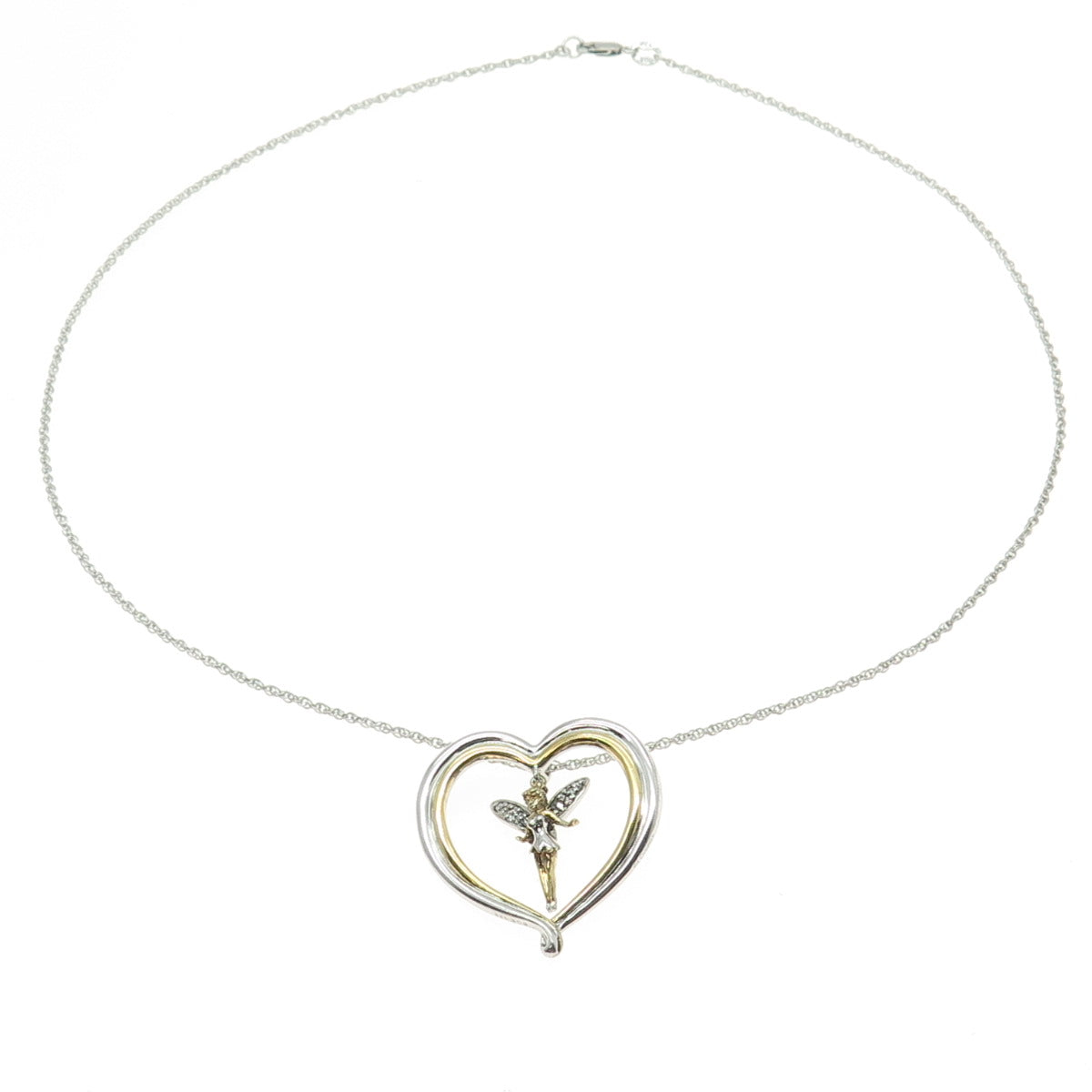 925 Sterling Silver 2-Tone Vintage C Z Tinker Bell Heart Necklace 18"