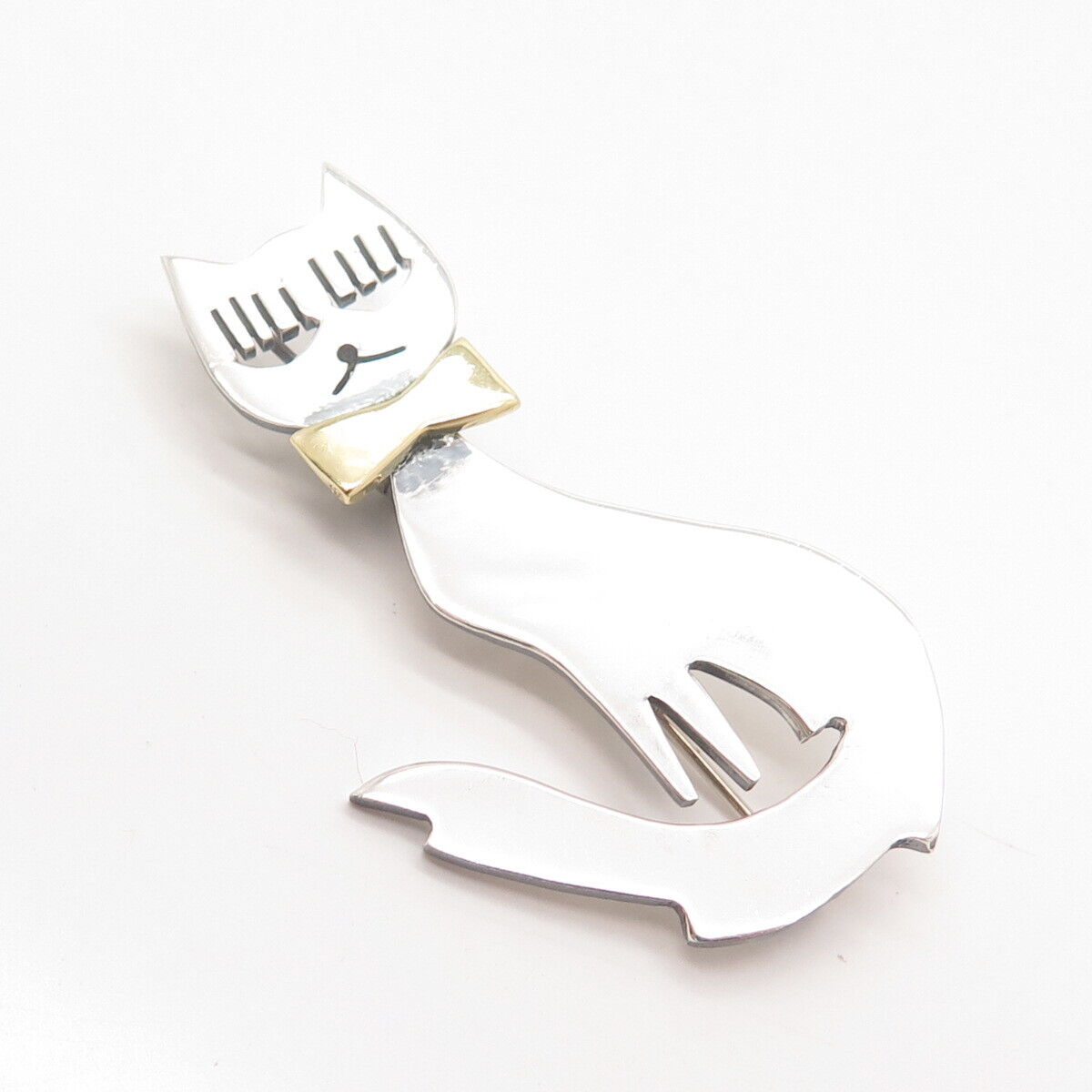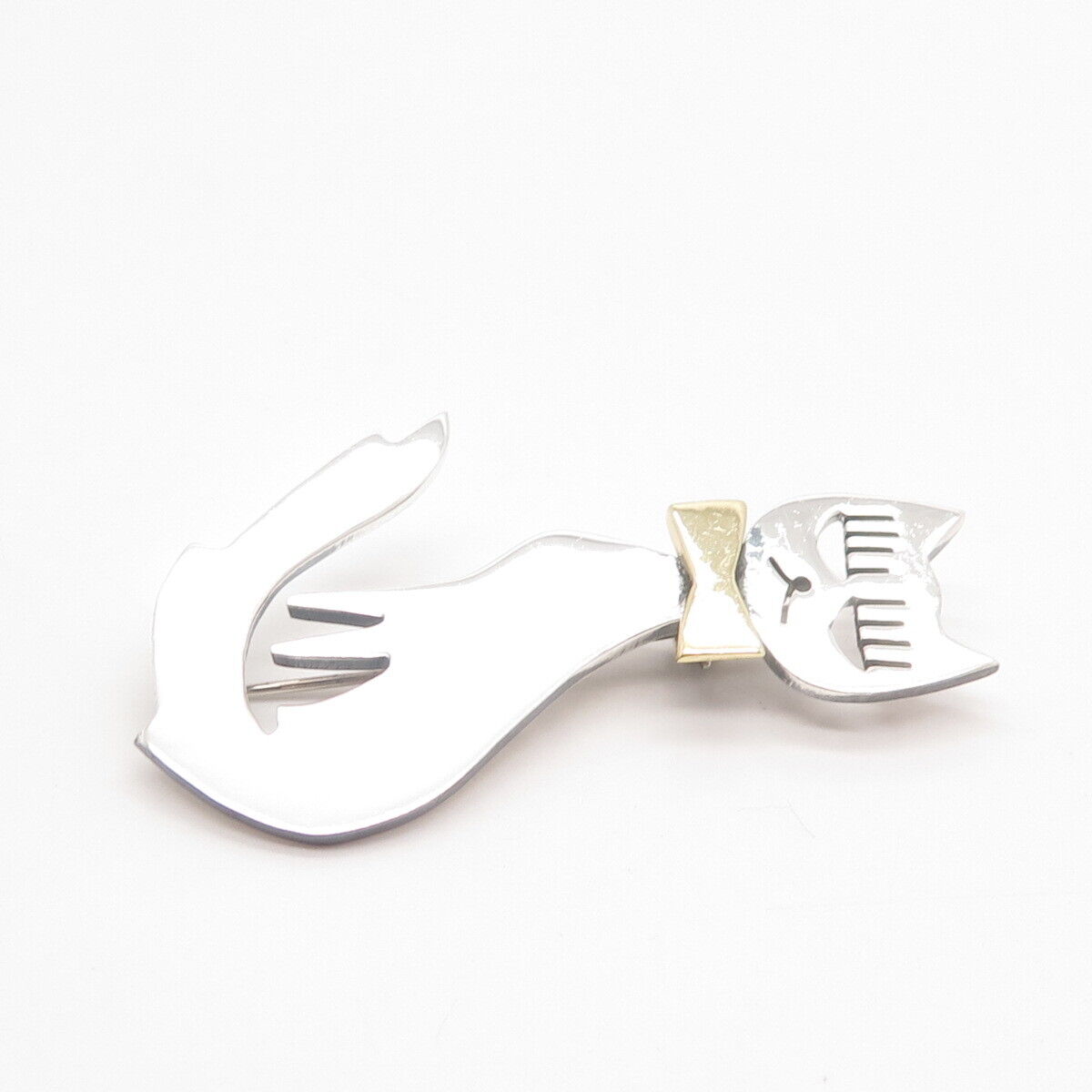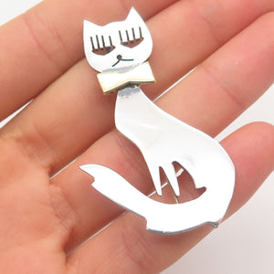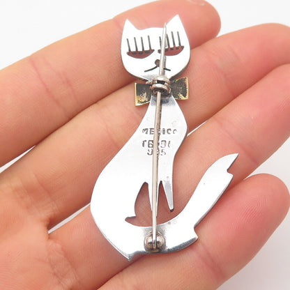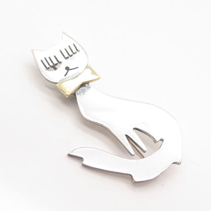 925 Sterling Silver 2-Tone Vintage Mexico Cat w/ Bow Pin Brooch