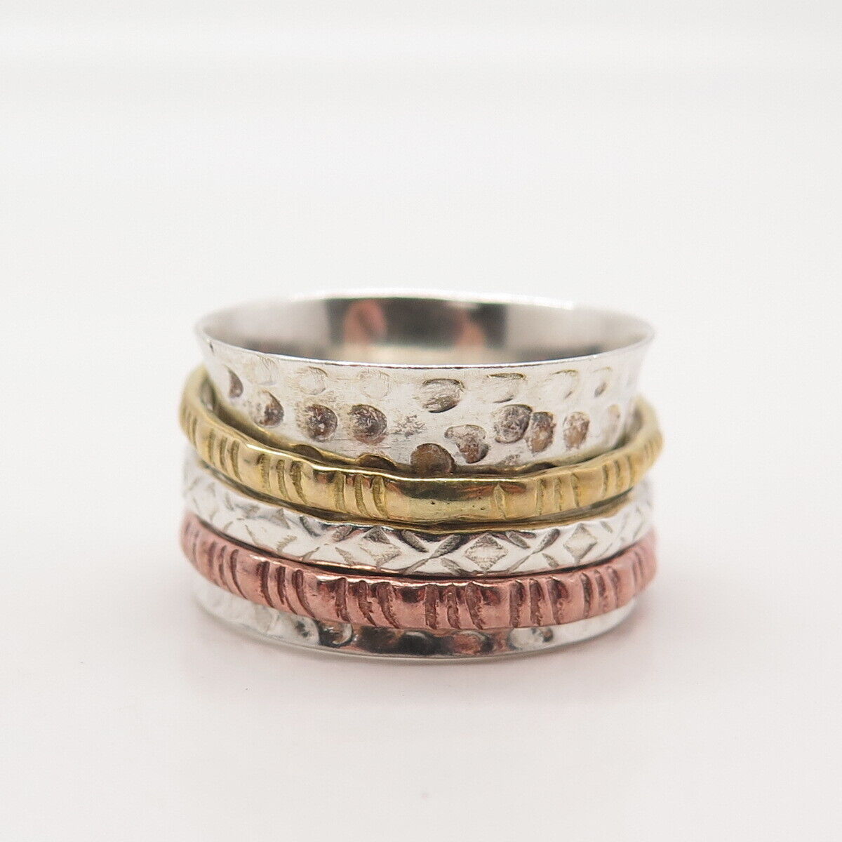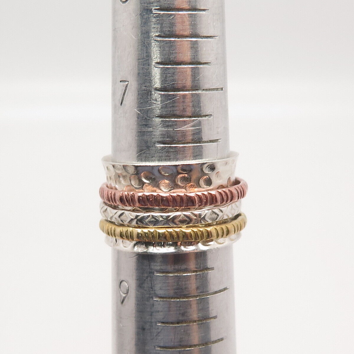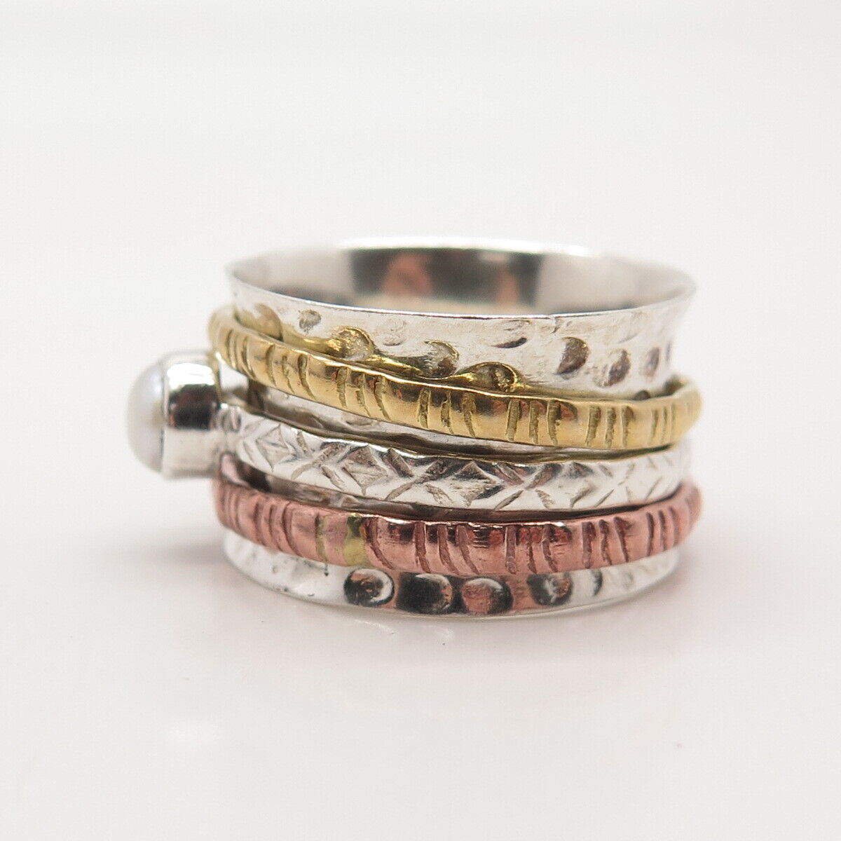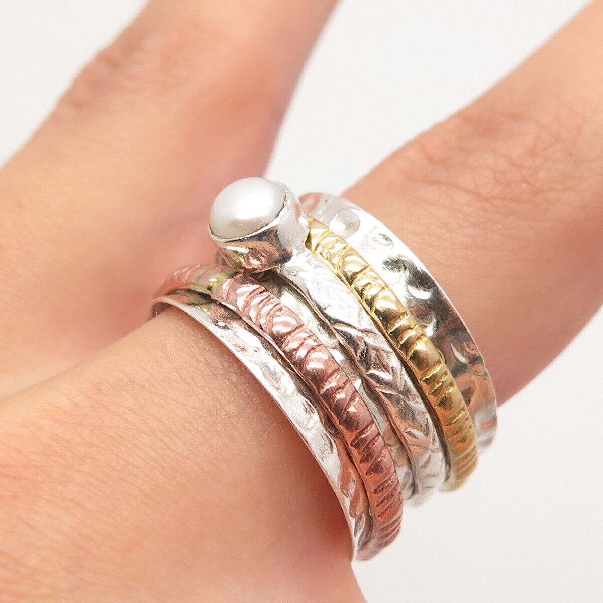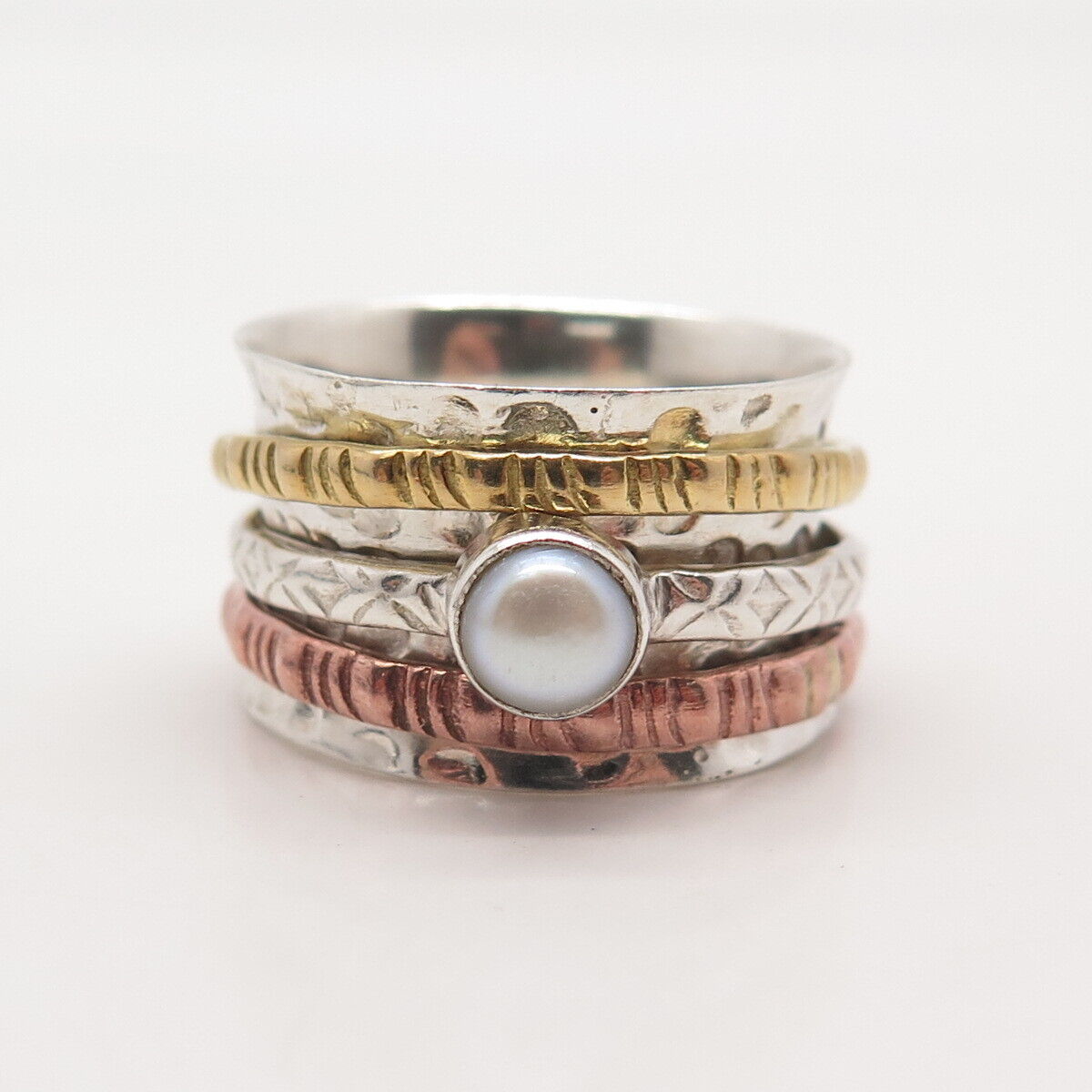 925 Sterling Silver 3-Tone Vintage Real Pearl Hammered Finish Ring Size 8.5