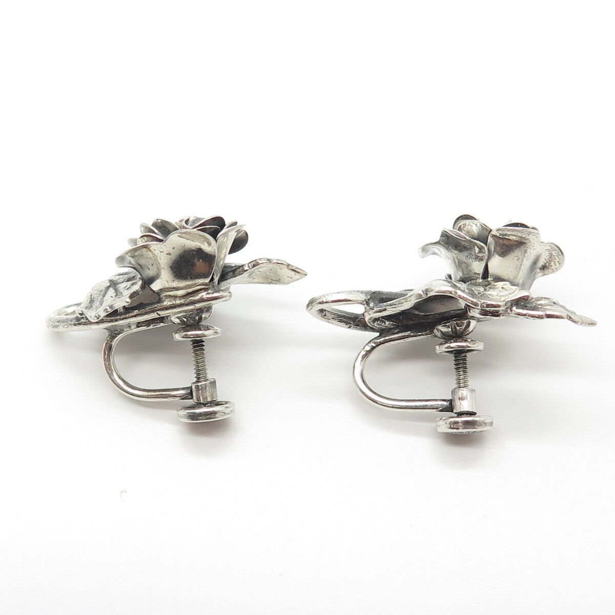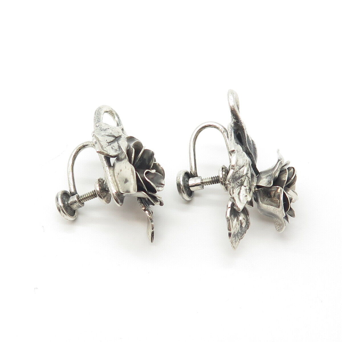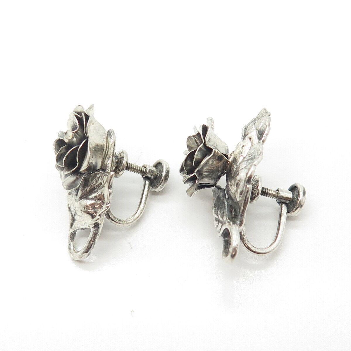 925 Sterling Silver Antique Art Deco Danecraft Rose Flower Screw Back Earrings