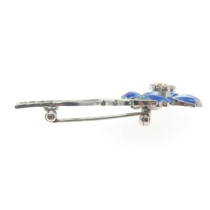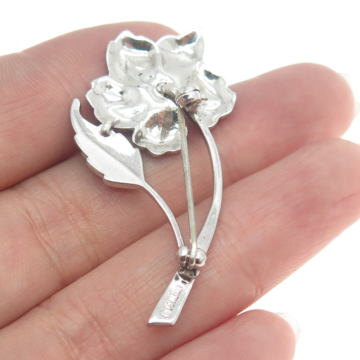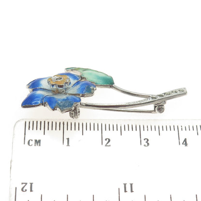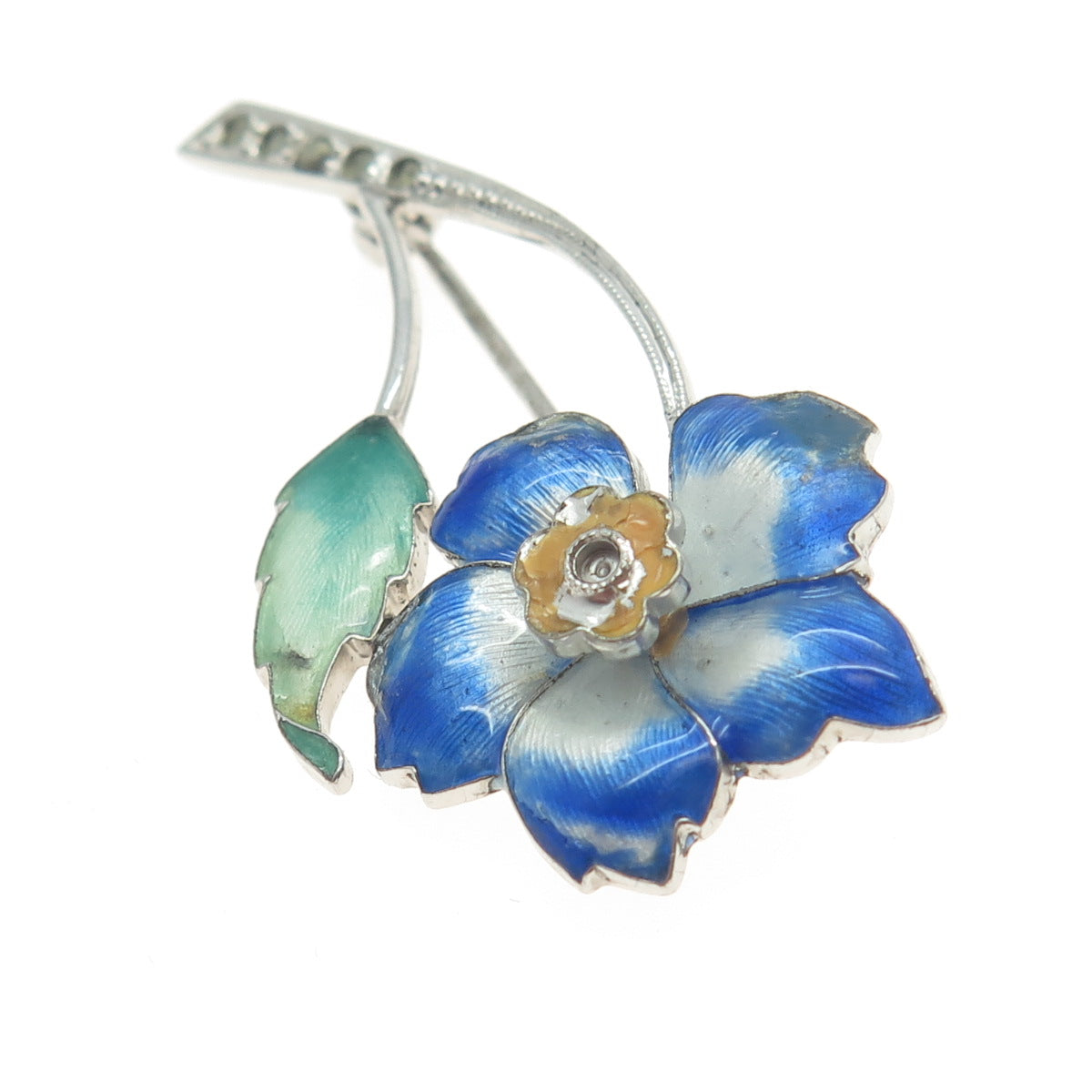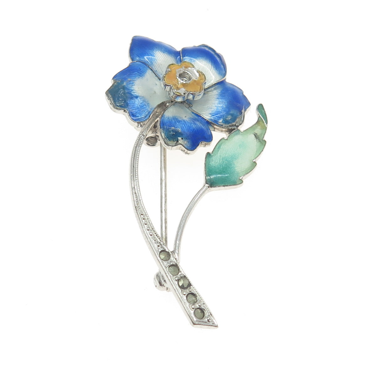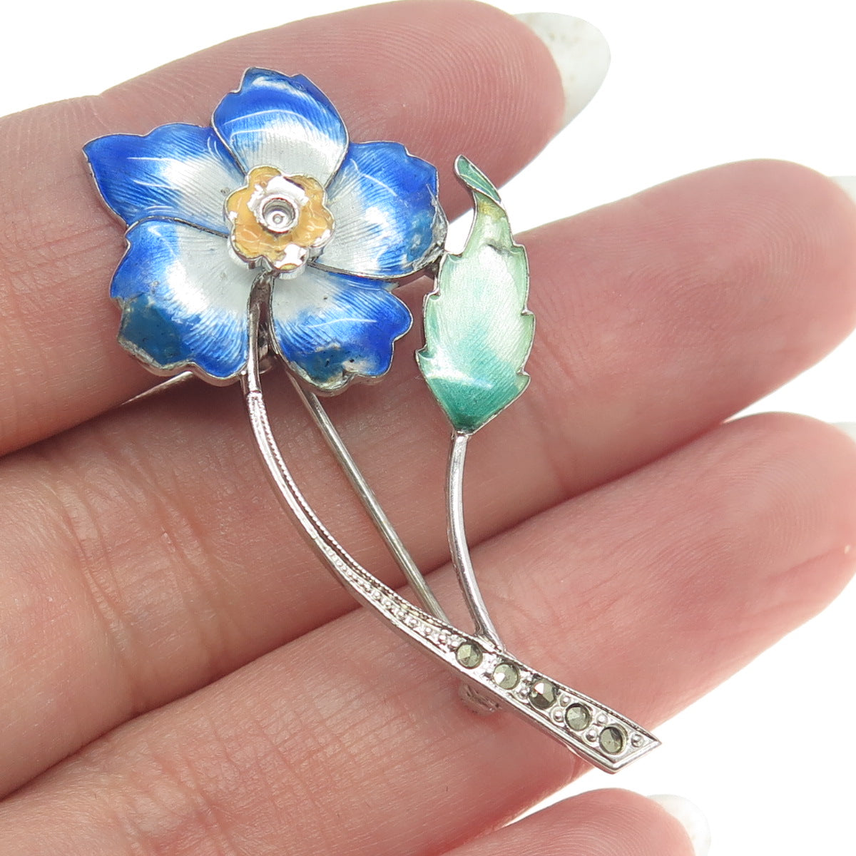 925 Sterling Silver Antique Art Deco Marcasite Gem & Enamel Flower Pin Brooch