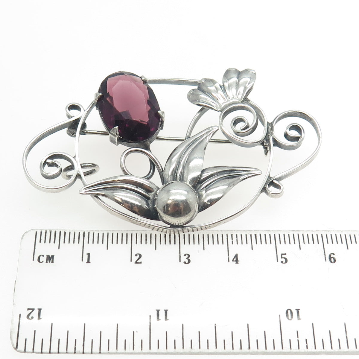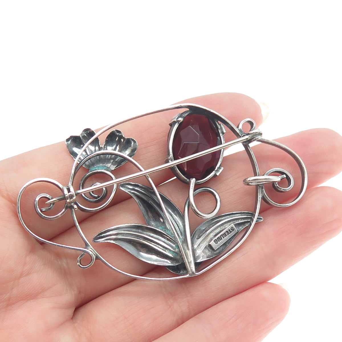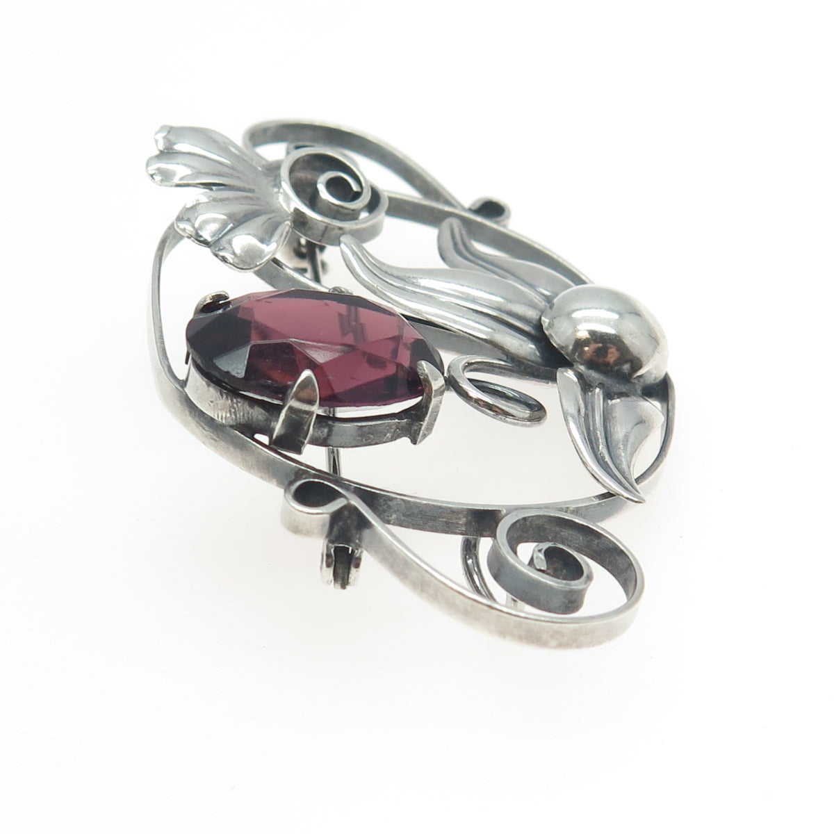 925 Sterling Silver Antique Art Deco Pink Glass Floral Pin Brooch