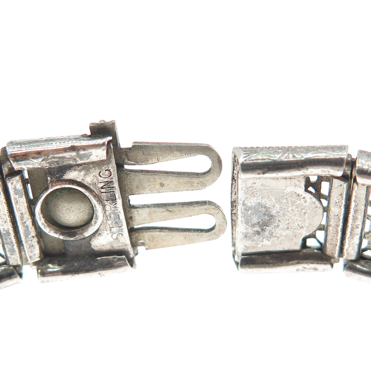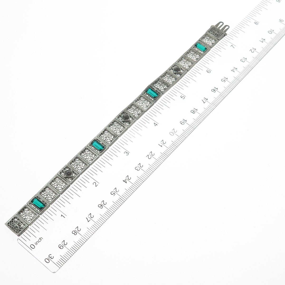 925 Sterling Silver Antique Emerald-Cut Glass & Rhinestone Filigree Bracelet 7"