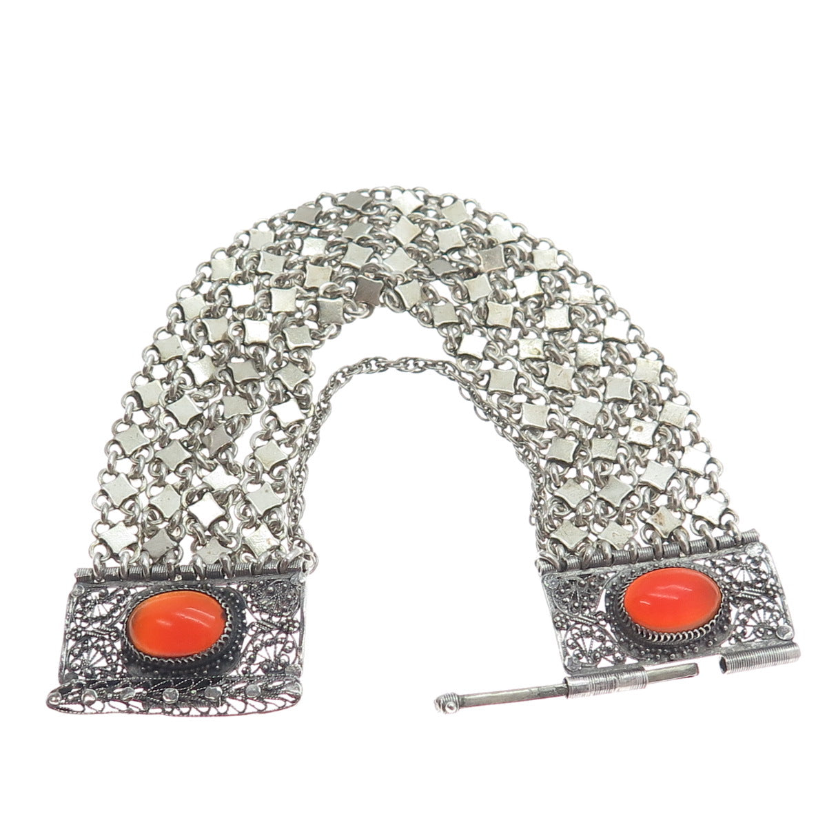 925 Sterling Silver Antique Real Carnelian Filigree Mesh Link Bracelet 6.75"