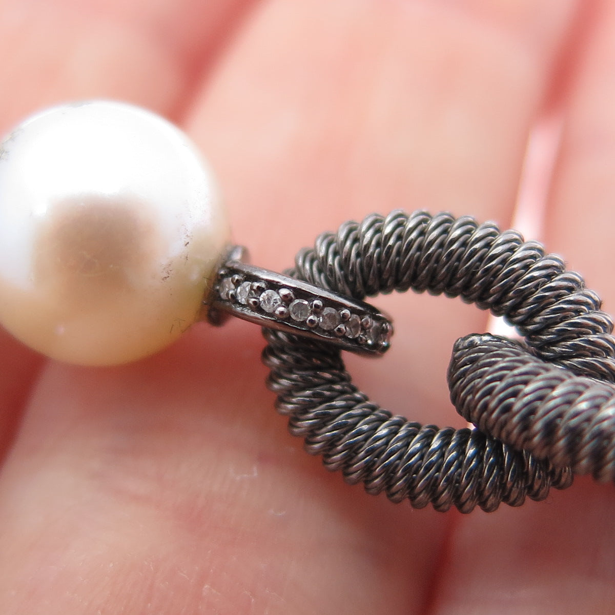 925 Sterling Silver Black Rhodium Vintage Real Diamond Pearl Chain Necklace 32"