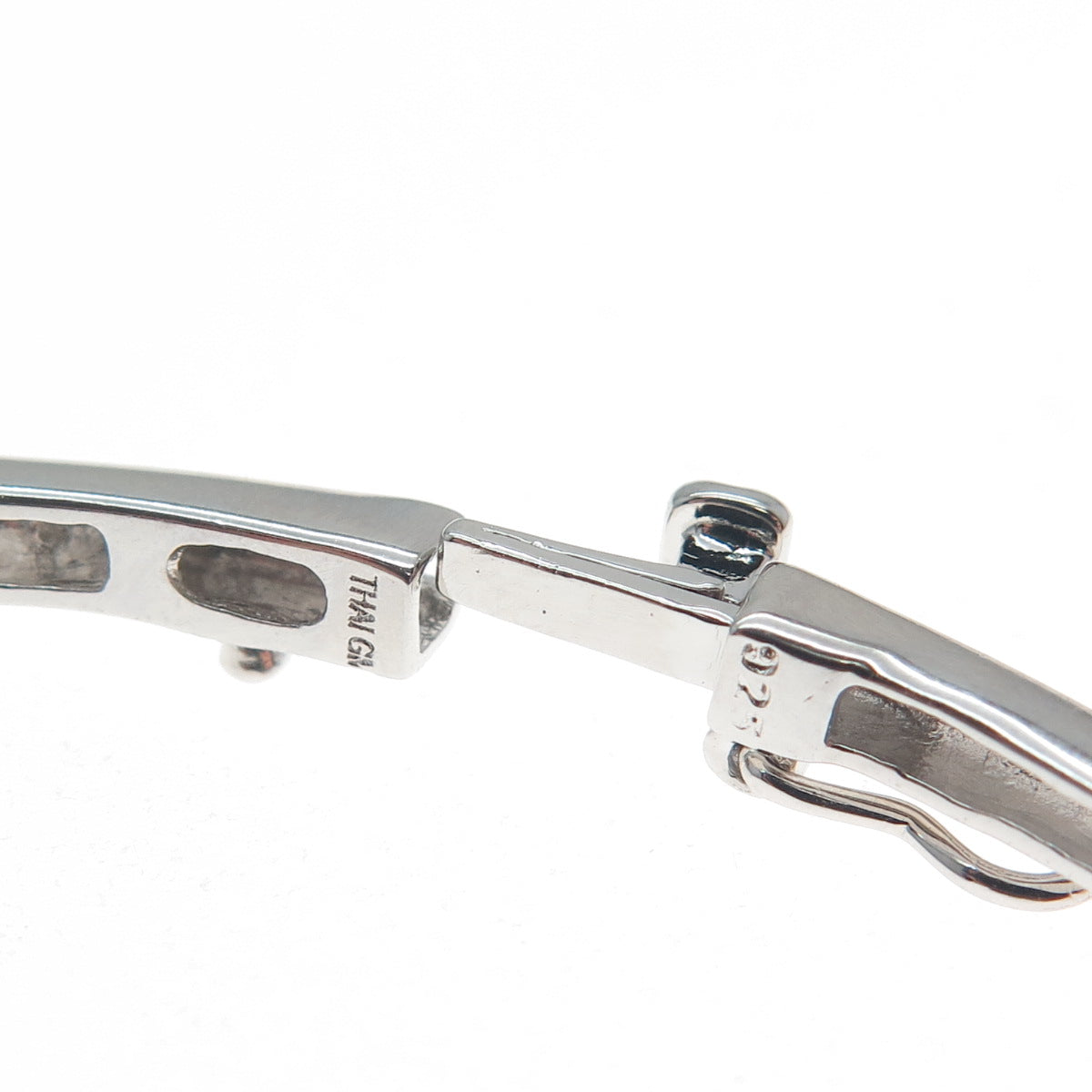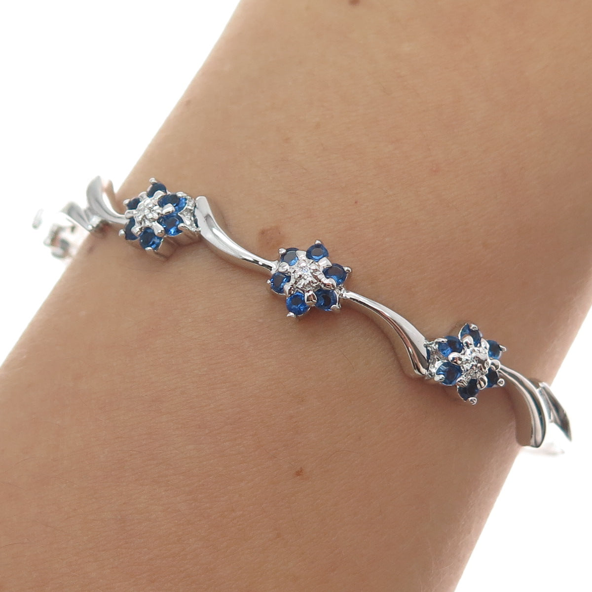 925 Sterling Silver Blue & White C Z Floral Hinged Bangle Bracelet 7"