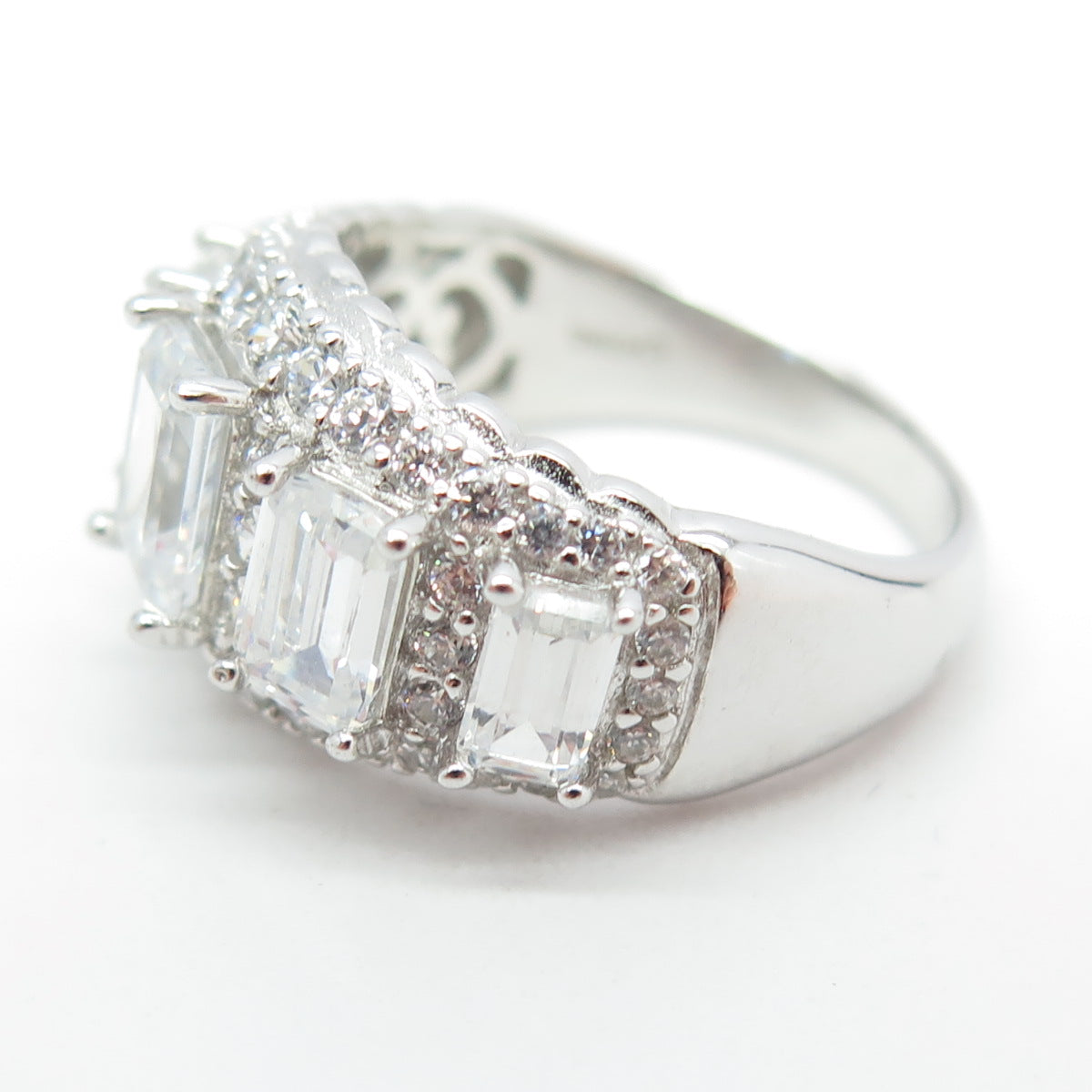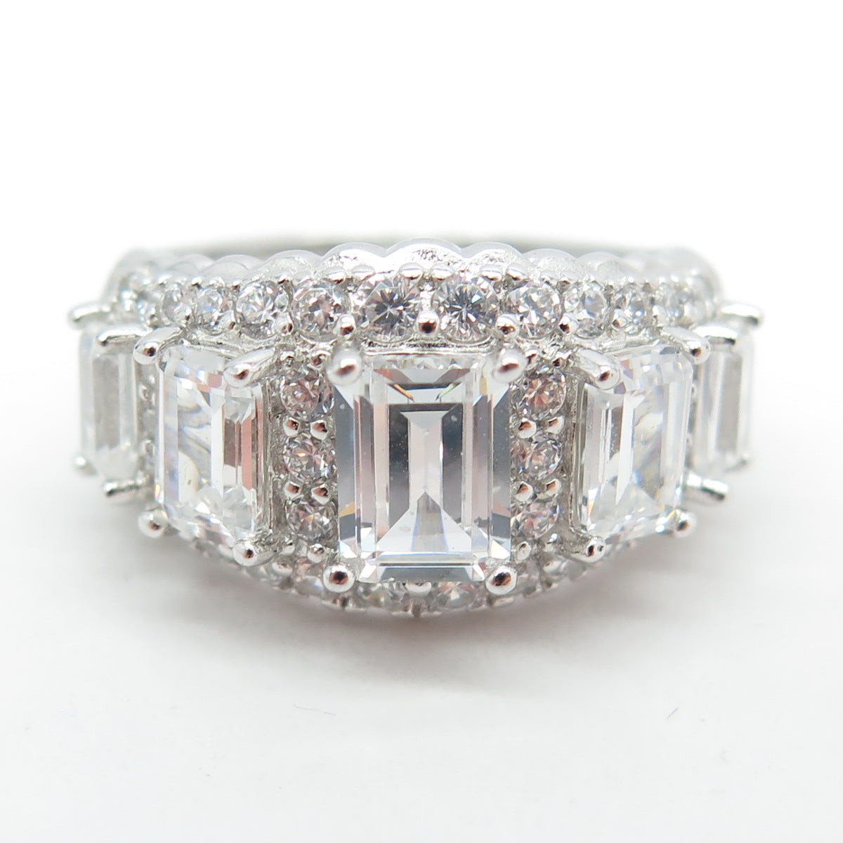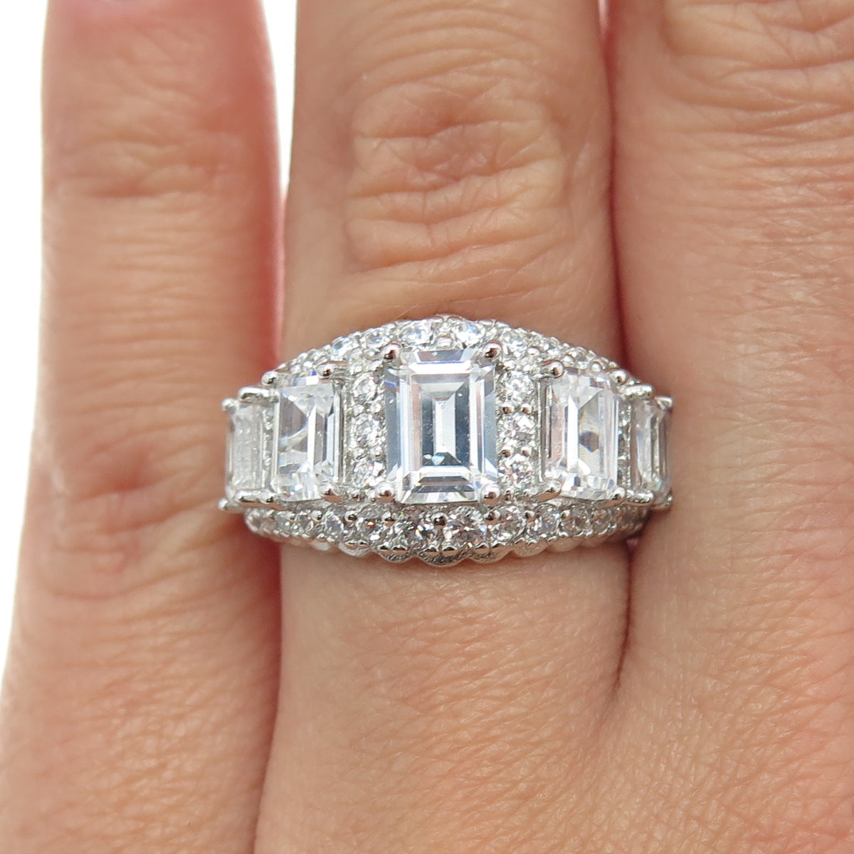 925 Sterling Silver Emerald & Round-Cut C Z Engagement Ring Size 7