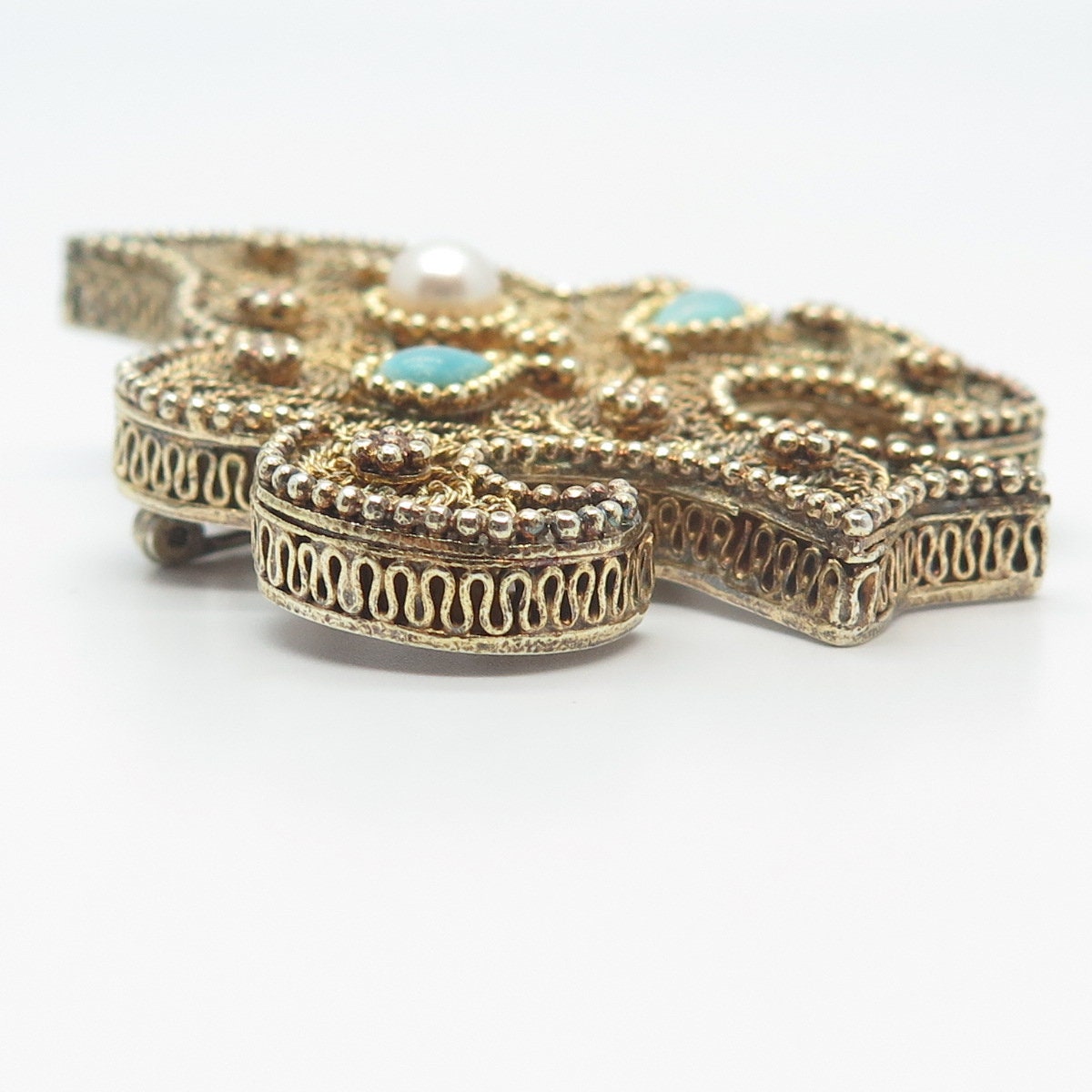 925 Sterling Silver Gold Plated Antique Real Pearl & Turquoise Tree Pin Brooch