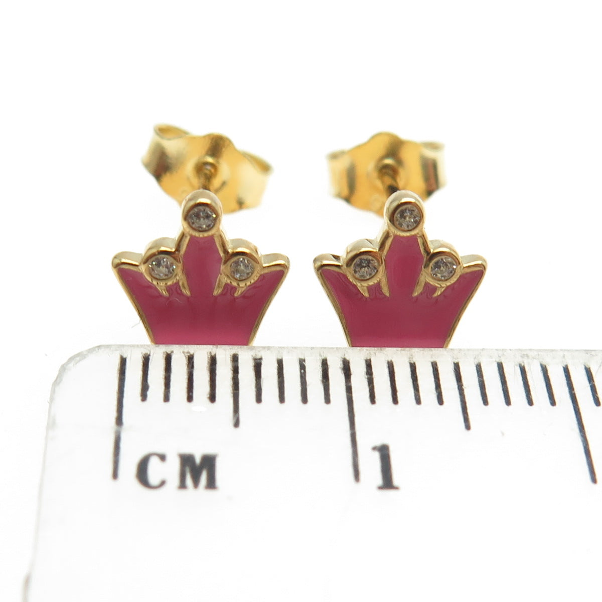 925 Sterling Silver Gold Plated C Z & Pink Enamel Crown Stud Earrings