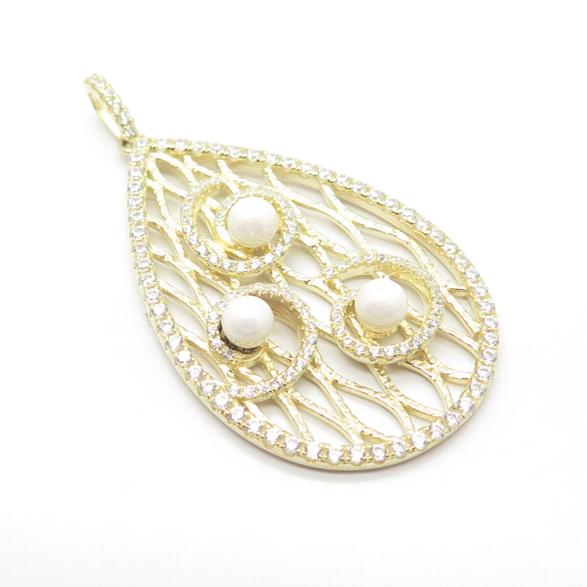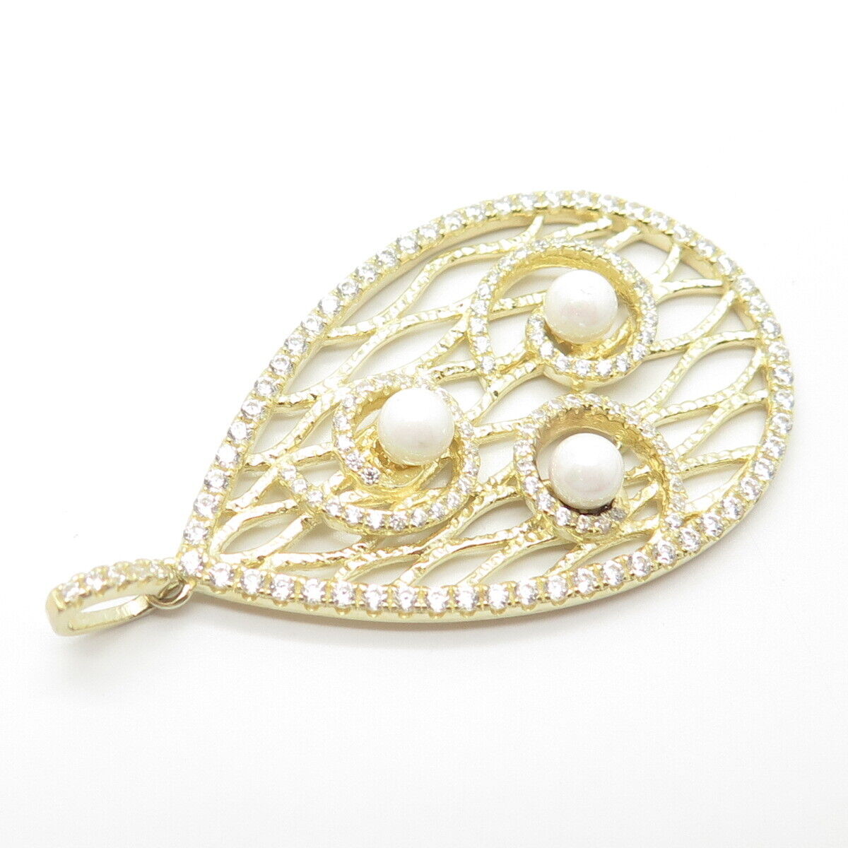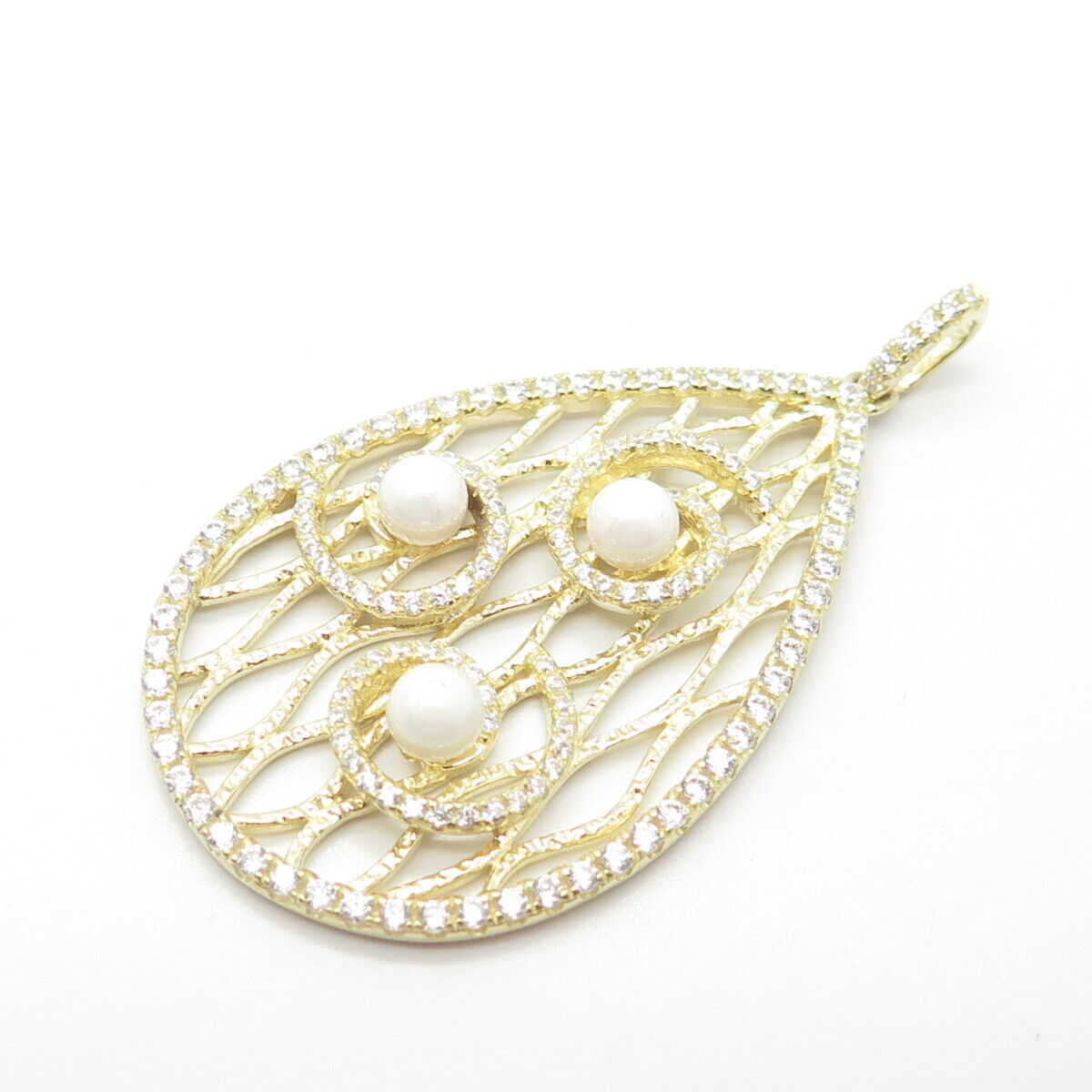 925 Sterling Silver Gold Plated Faux Pearl & Pave C Z Teardrop Pendant