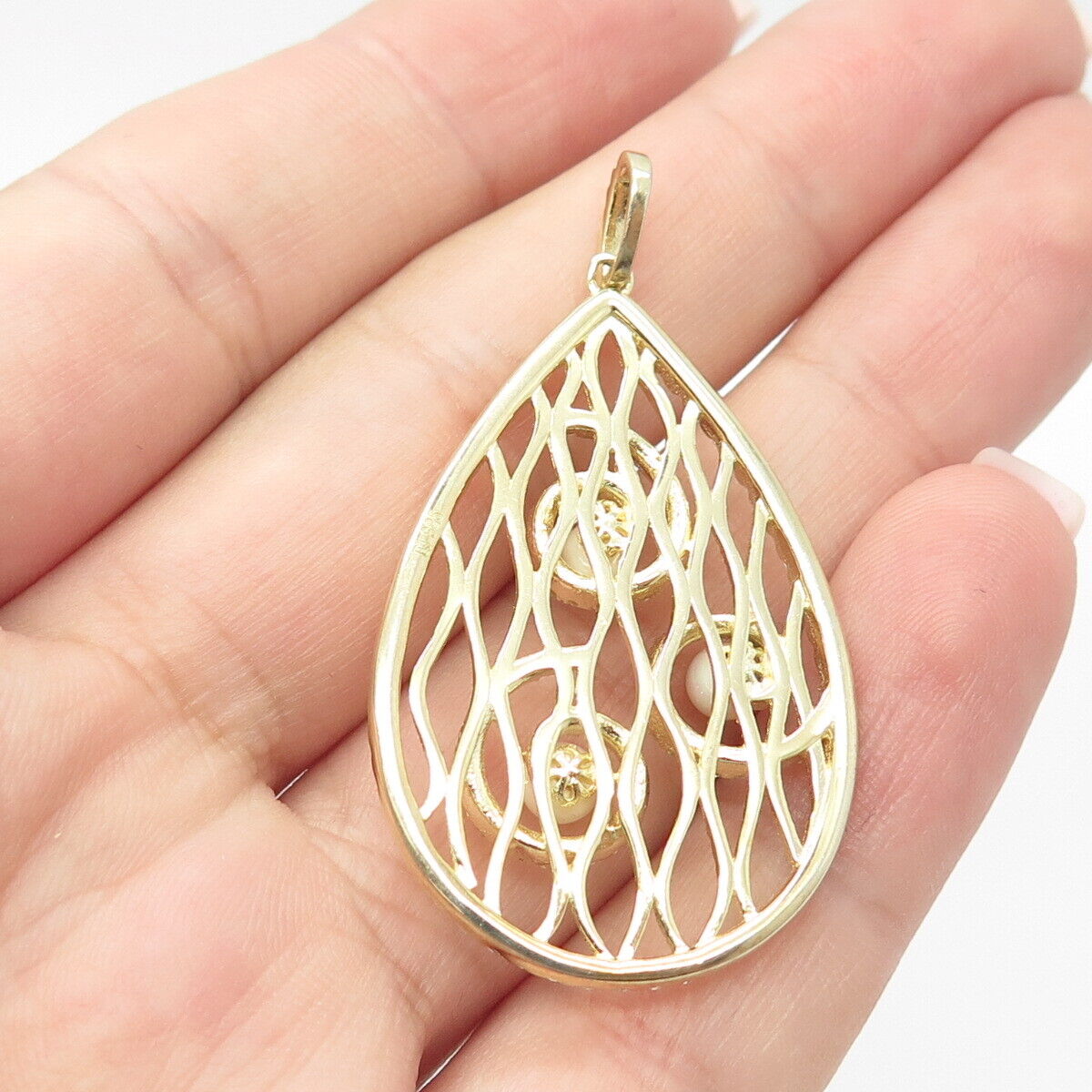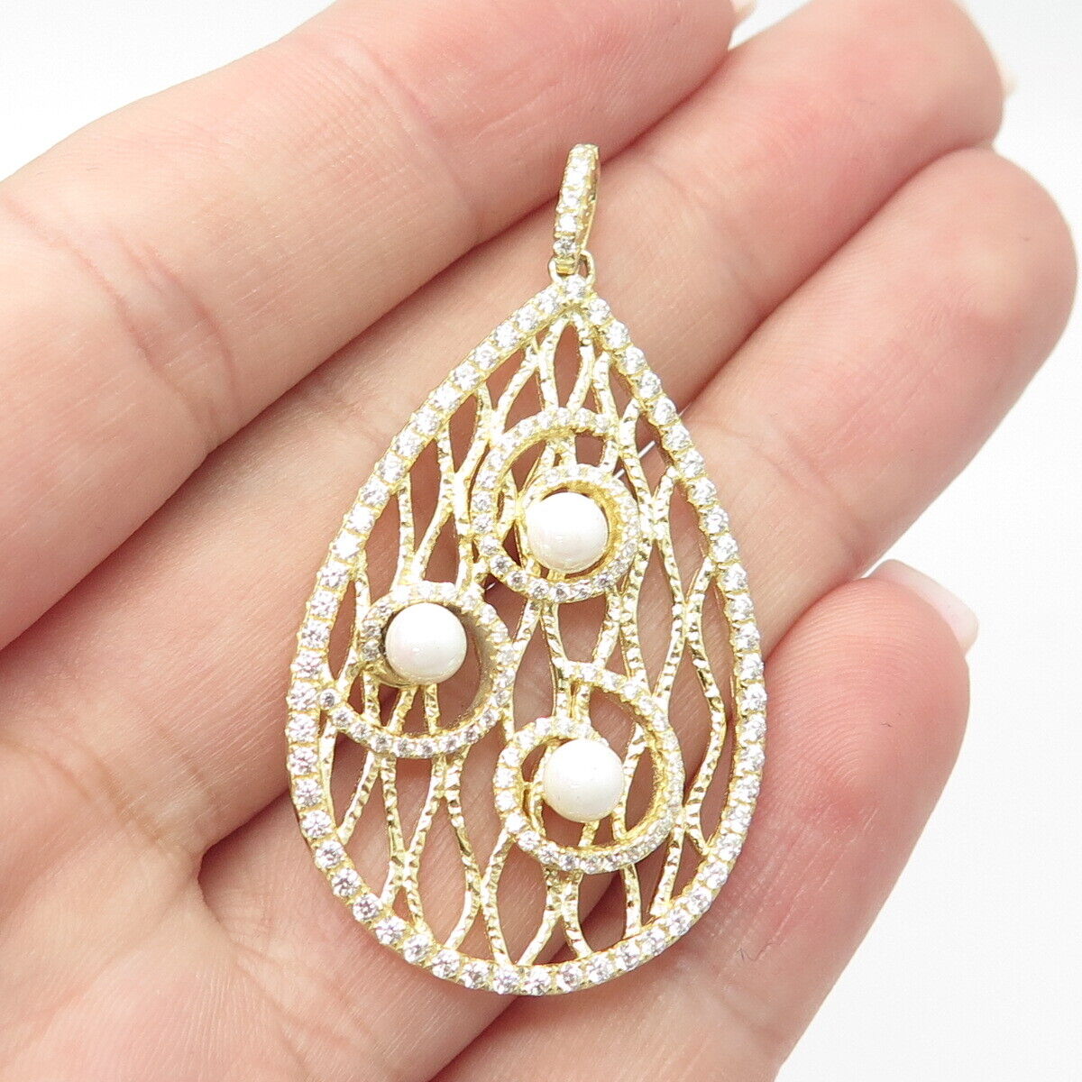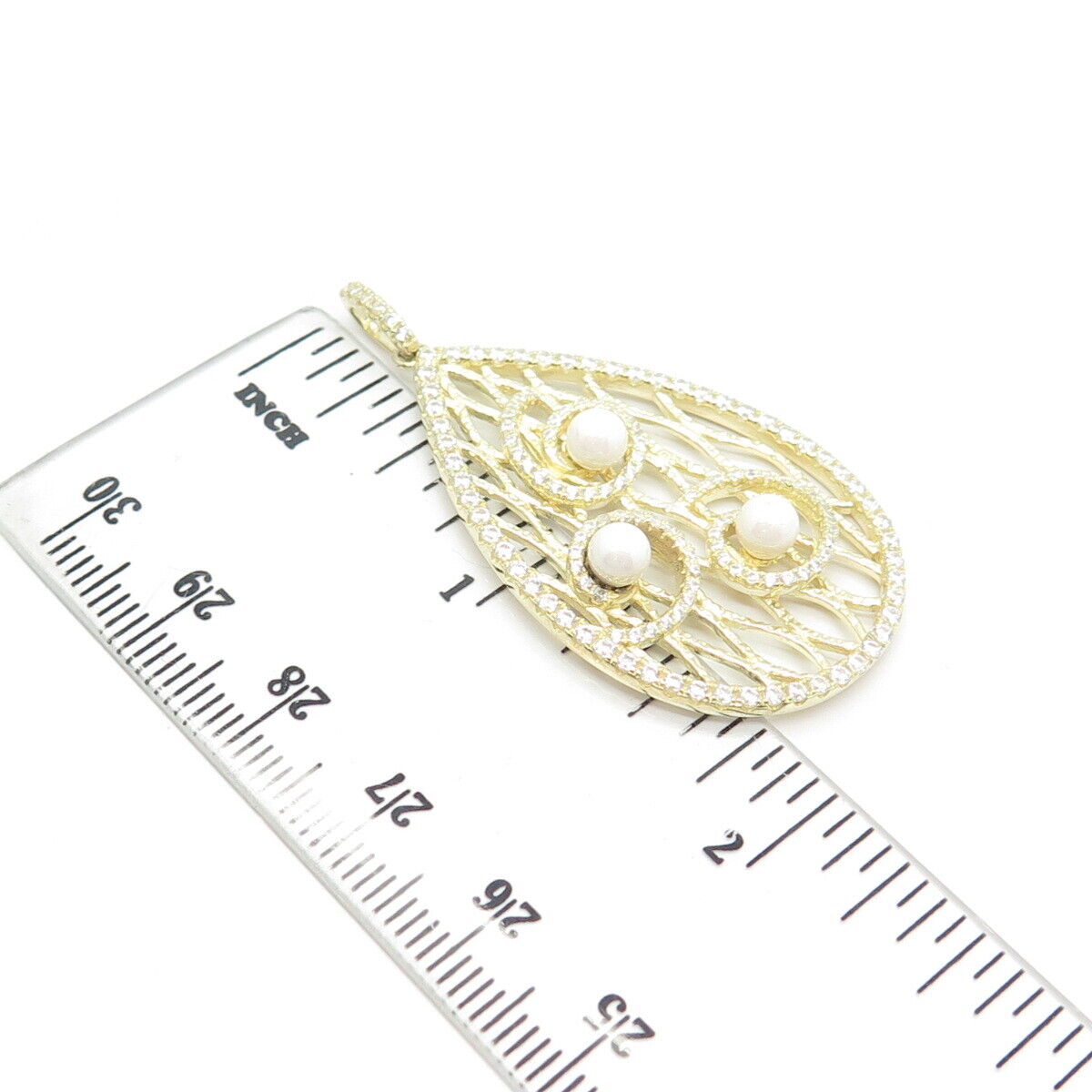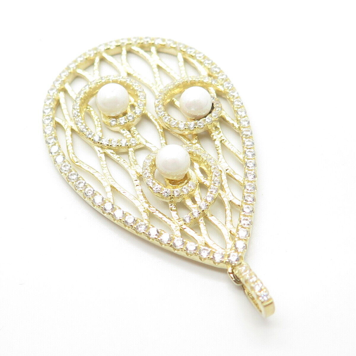 925 Sterling Silver Gold Plated Faux Pearl & Pave C Z Teardrop Pendant