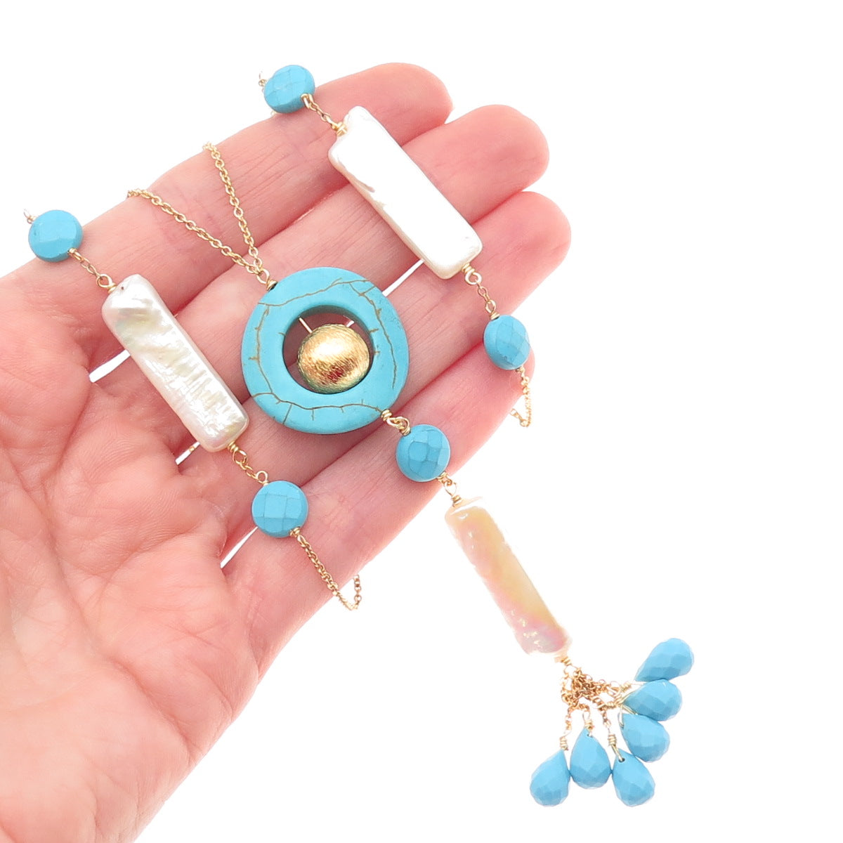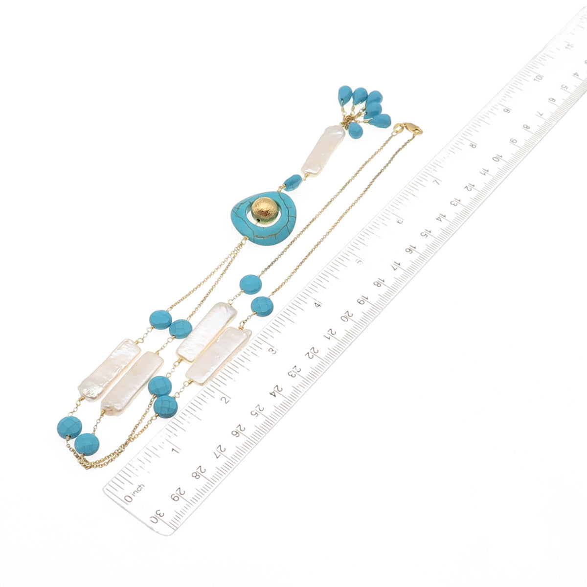 925 Sterling Silver Gold Plated Vintage Italy Real Pearl Turquoise Necklace 26"