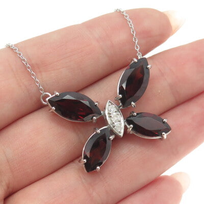 925 Sterling Silver Italy Real Diamond & Red Garnet Gem Butterfly Necklace 18"