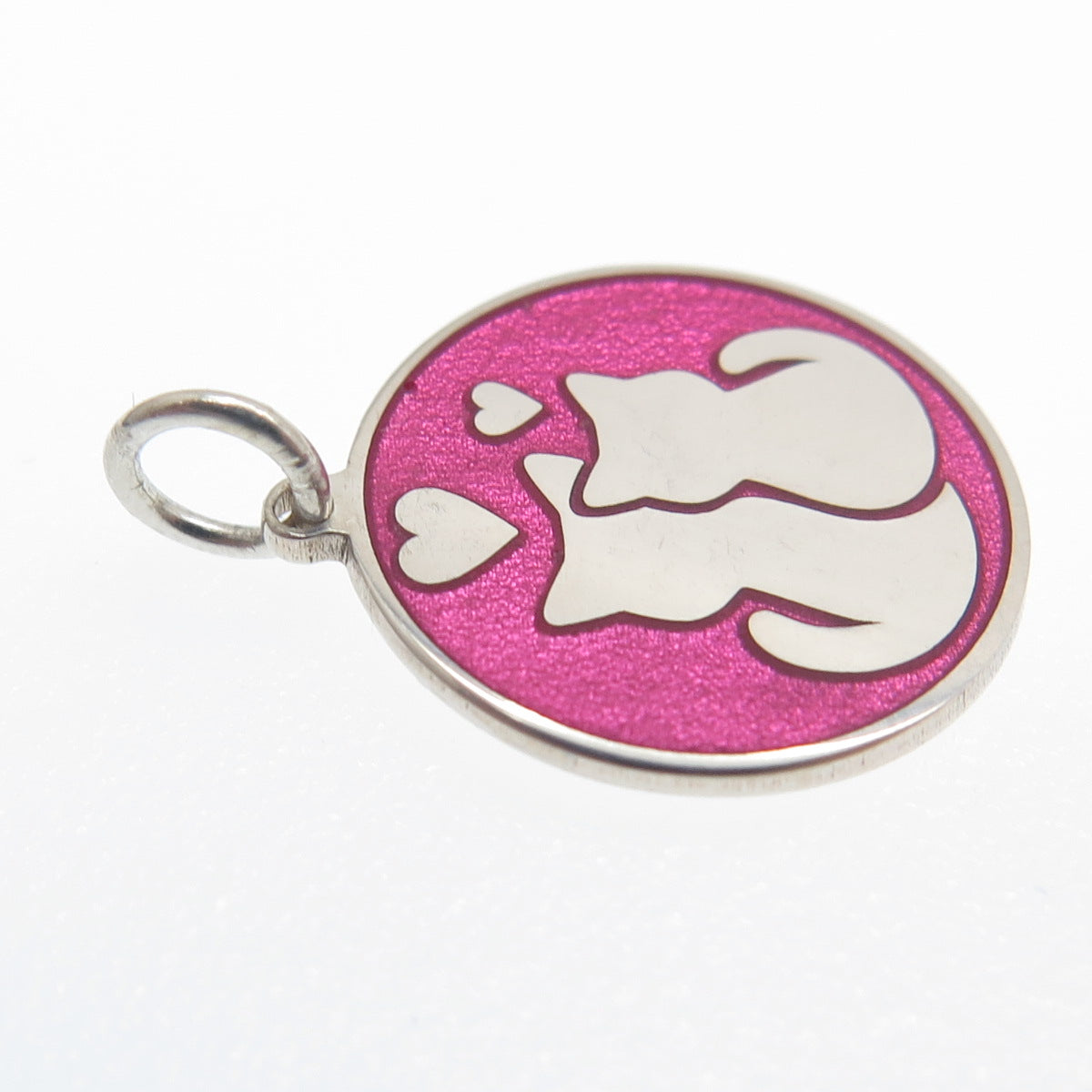 925 Sterling Silver Pink Enamel Cat Couple Round Tag Minimalist Charm Pendant
