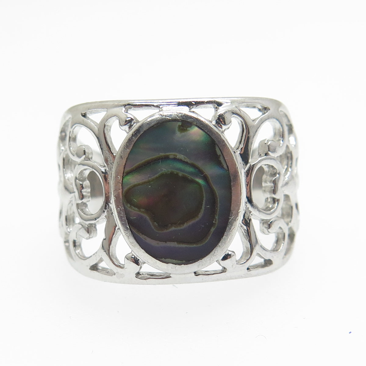 925 Sterling Silver Real Abalone Shell Ornate Ring Size 9.25