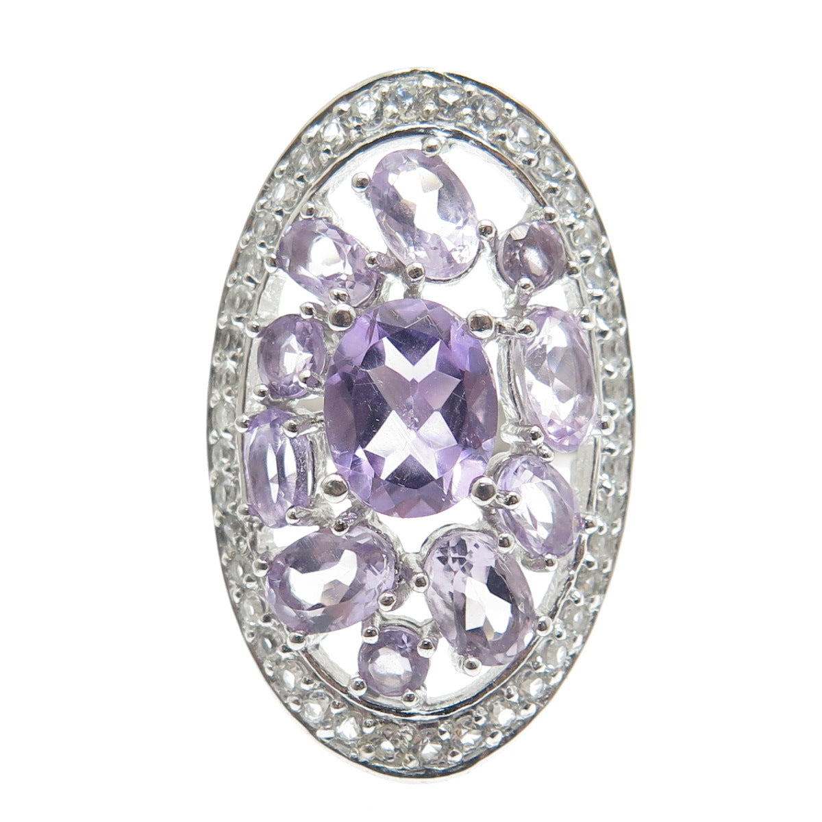925 Sterling Silver Real Amethyst & White Topaz Cluster Ring Size 7