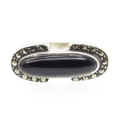 925 Sterling Silver Real Black Onyx & Marcasite Gem Art-Deco-Style Ring Size 6