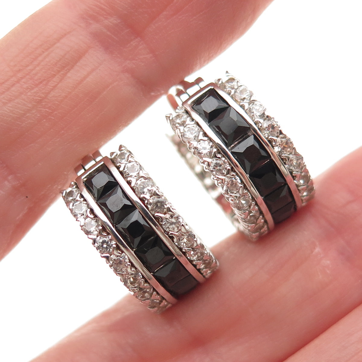 925 Sterling Silver Real Black Spinel & White Topaz Hoop Earrings