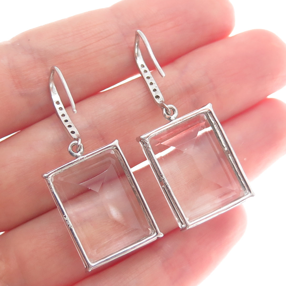 925 Sterling Silver Real Diamond & Emerald-Cut White Topaz Dangle Earrings