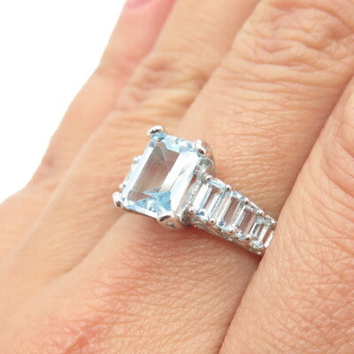 925 Sterling Silver Real Emerald-Cut Blue Topaz Engagement Ring Size 8