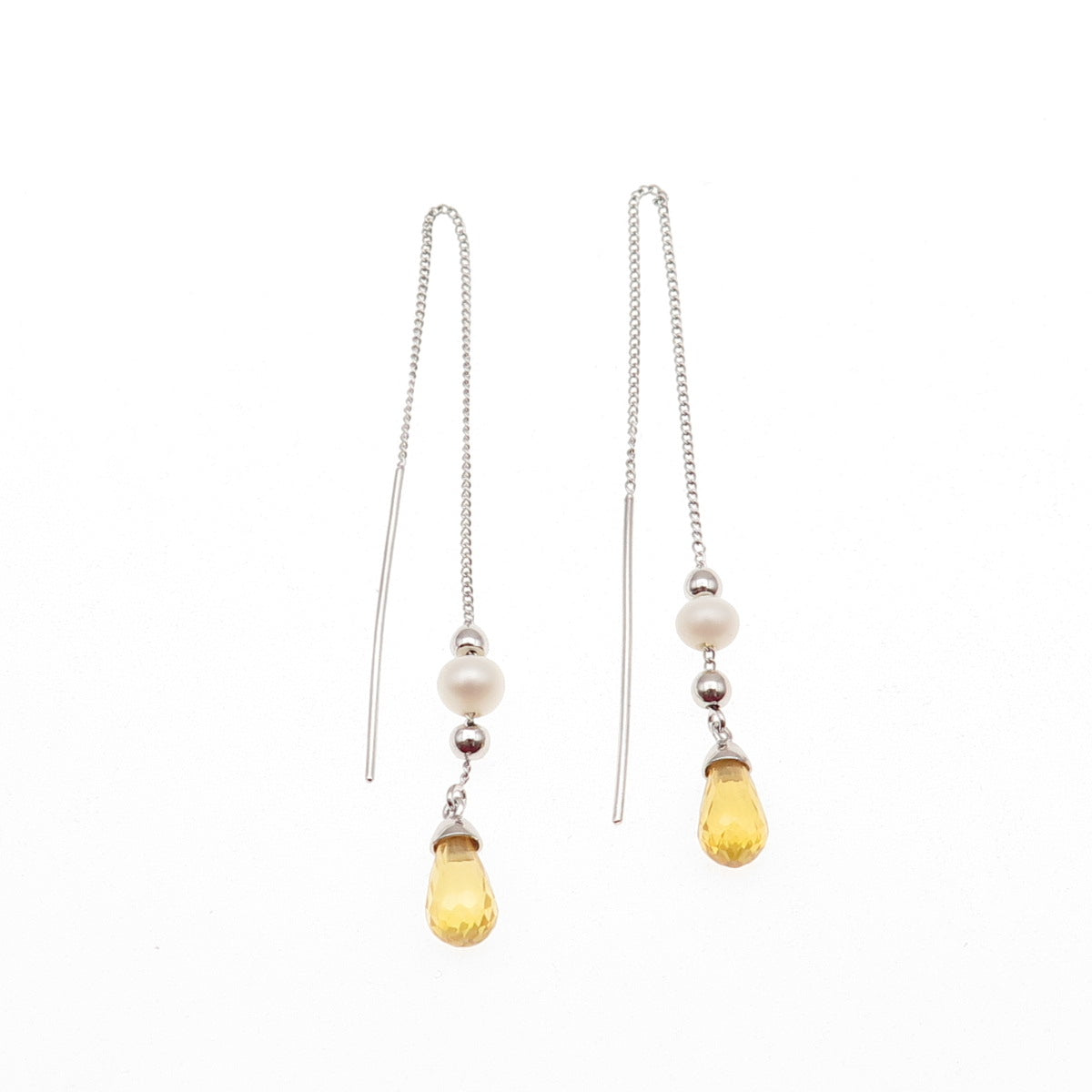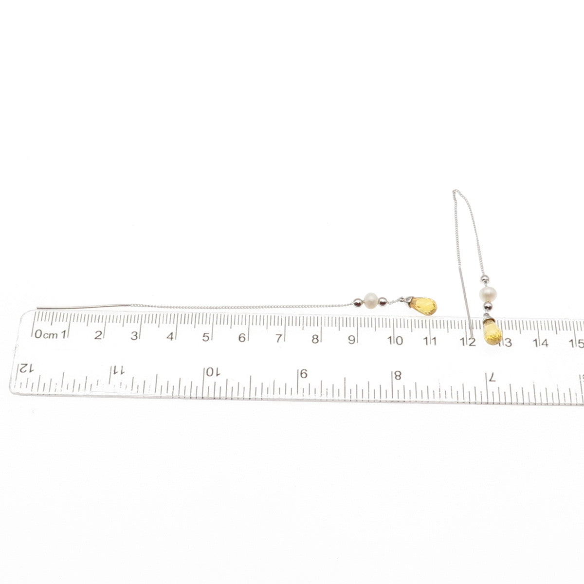 925 Sterling Silver Real Lemon Quartz & Pearl Long Chain Drop Dangle Earrings
