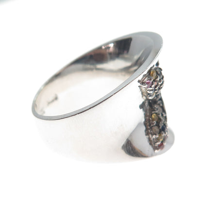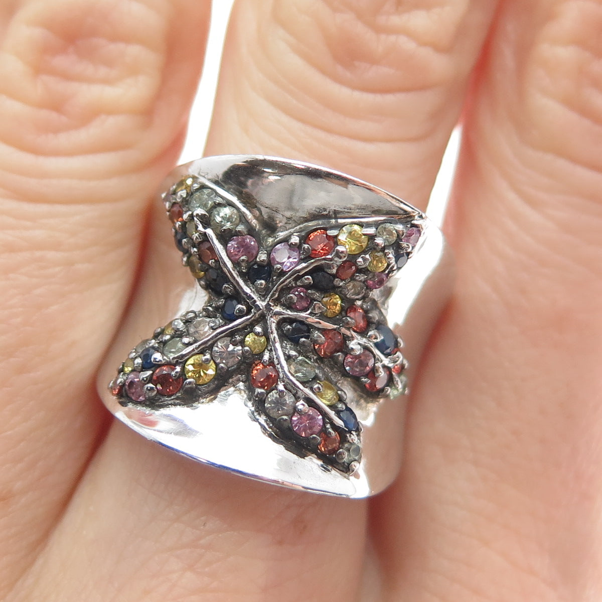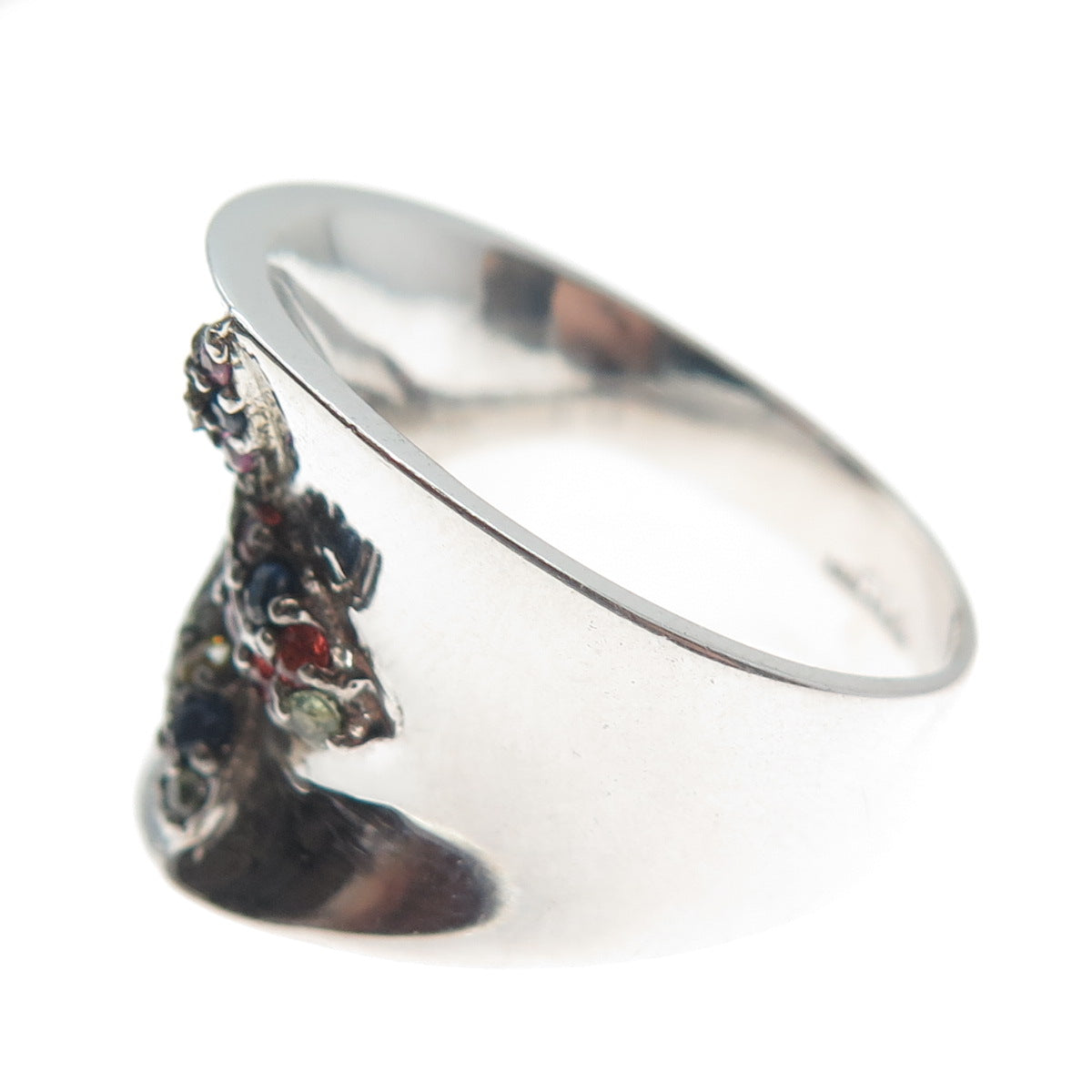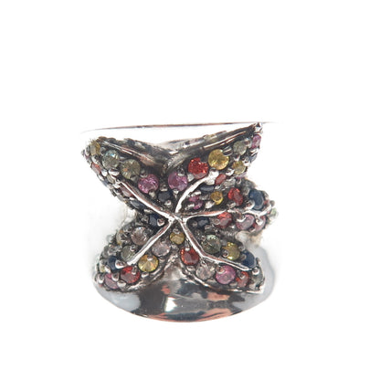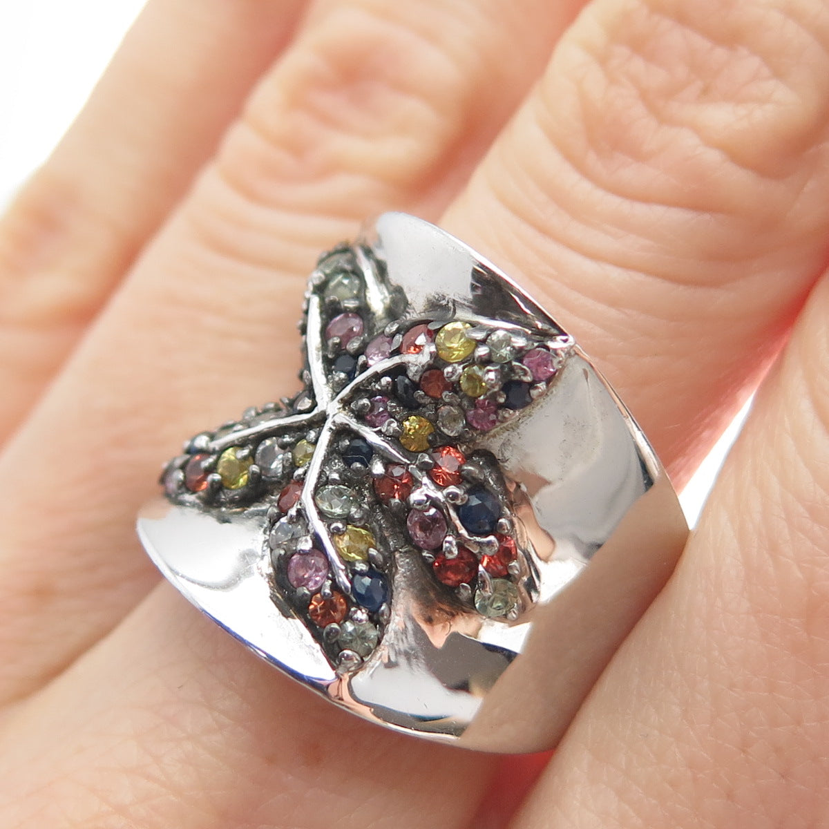 925 Sterling Silver Real Multi-Color Sapphire Floral Leaf Ring Size 8