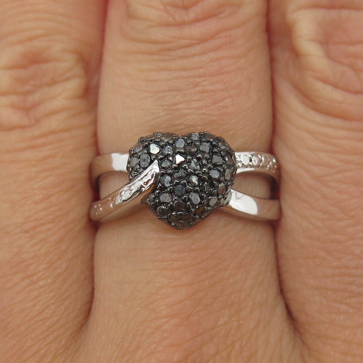 925 Sterling Silver Real Round-Cut Black Diamond Heart Ring Size 7.75
