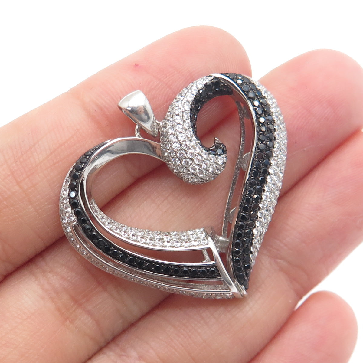 925 Sterling Silver Real Round-Cut Black Spinel & C Z Heart Pendant