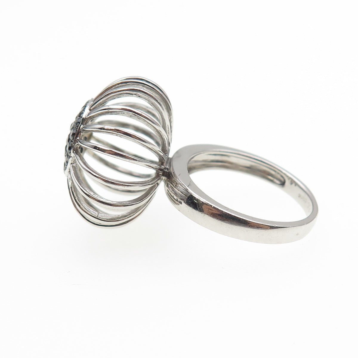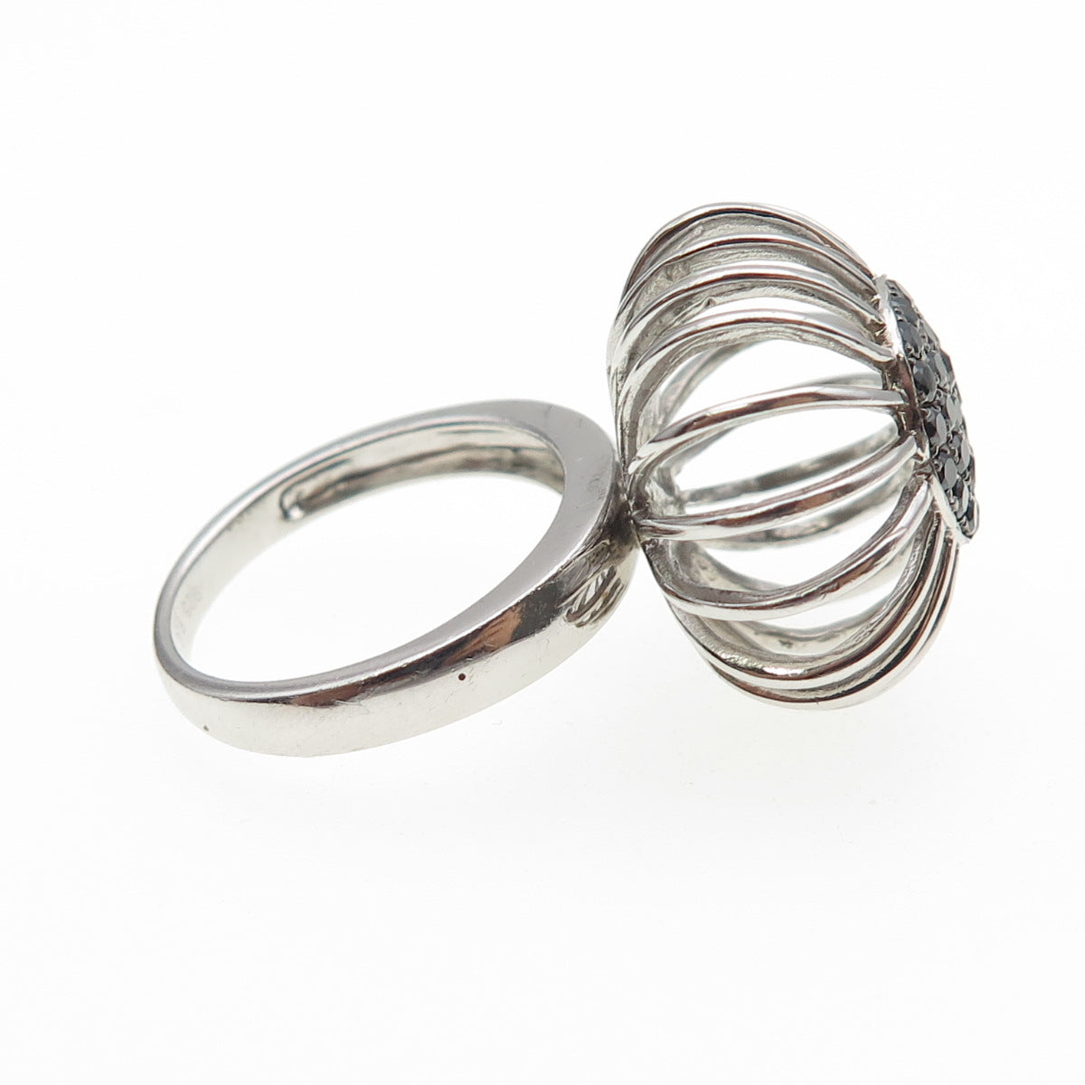 925 Sterling Silver Real Round-Cut Black Spinel Modernist Flower Ring Size 7.25