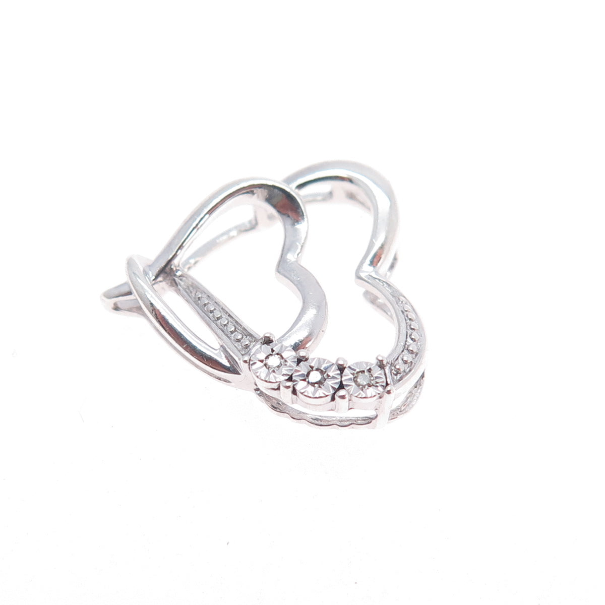 925 Sterling Silver Real Round-Cut Diamond Double Heart Mini Slide Charm Pendant