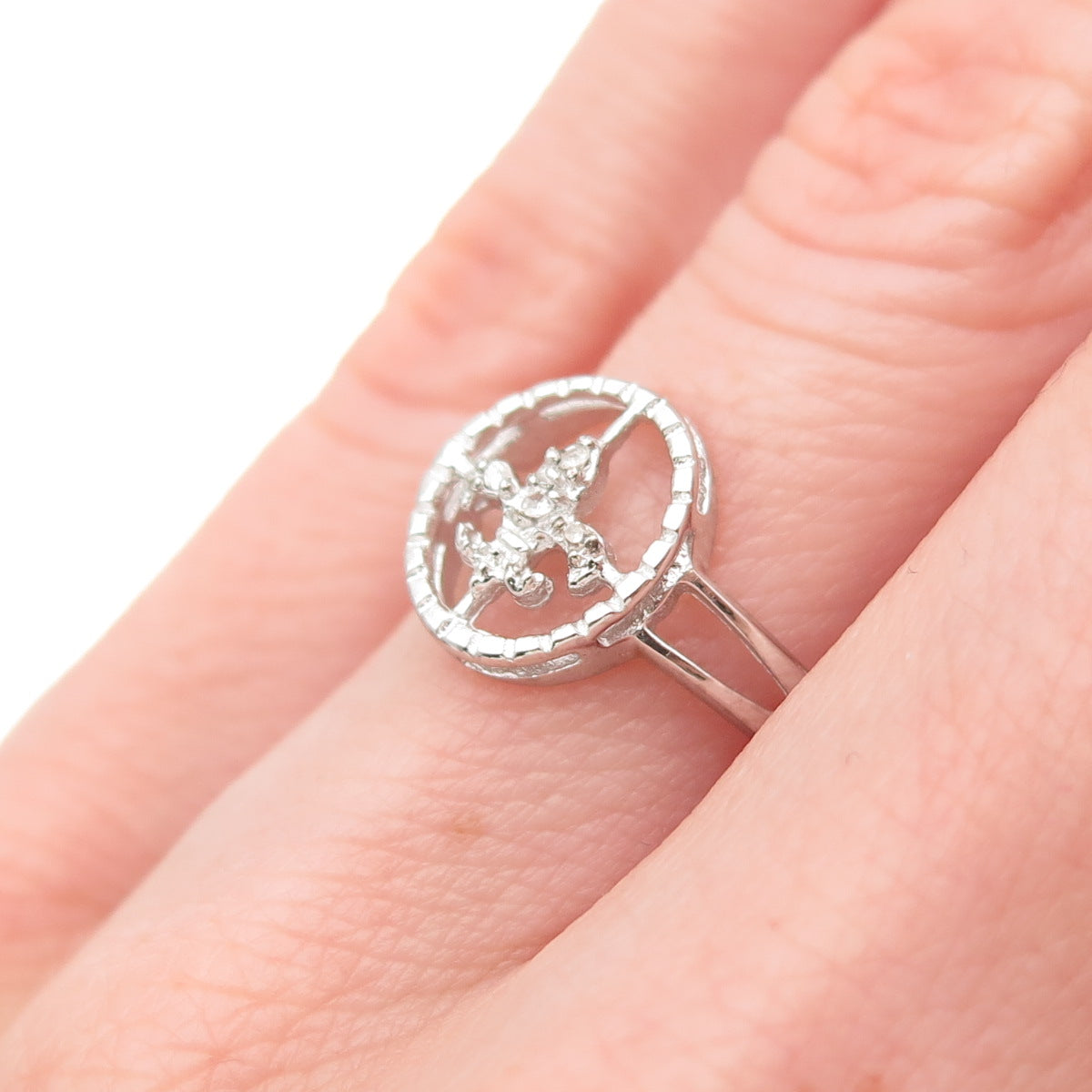 925 Sterling Silver Real Round-Cut Diamond Fleur de Lis Ring Size 6