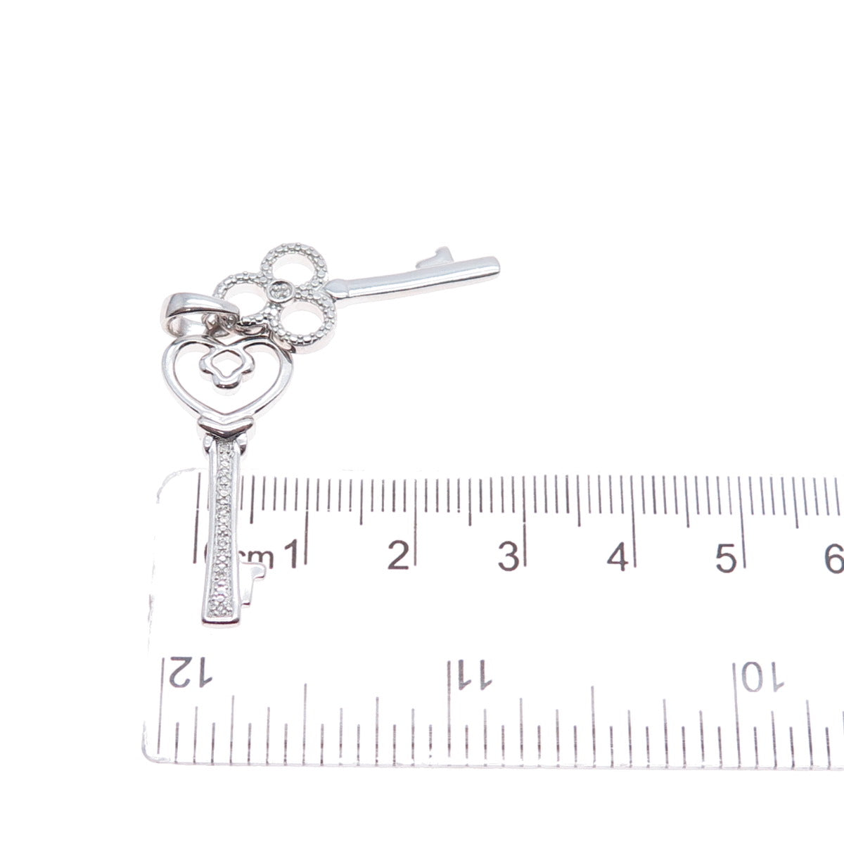 925 Sterling Silver Real Round-Cut Diamond Heart & Club Key Charm Pendant