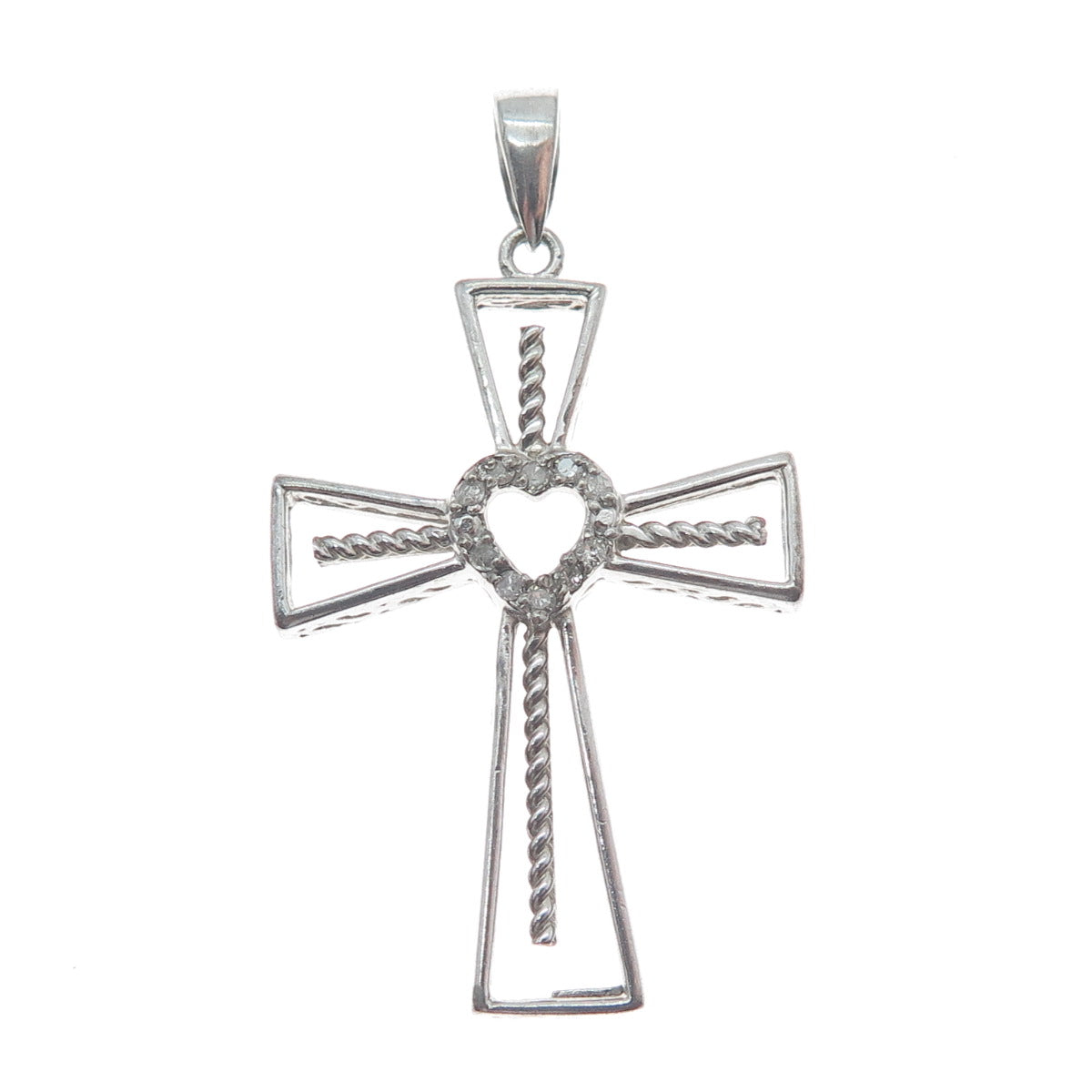 925 Sterling Silver Real Round-Cut Diamond Heart Cross Charm Pendant