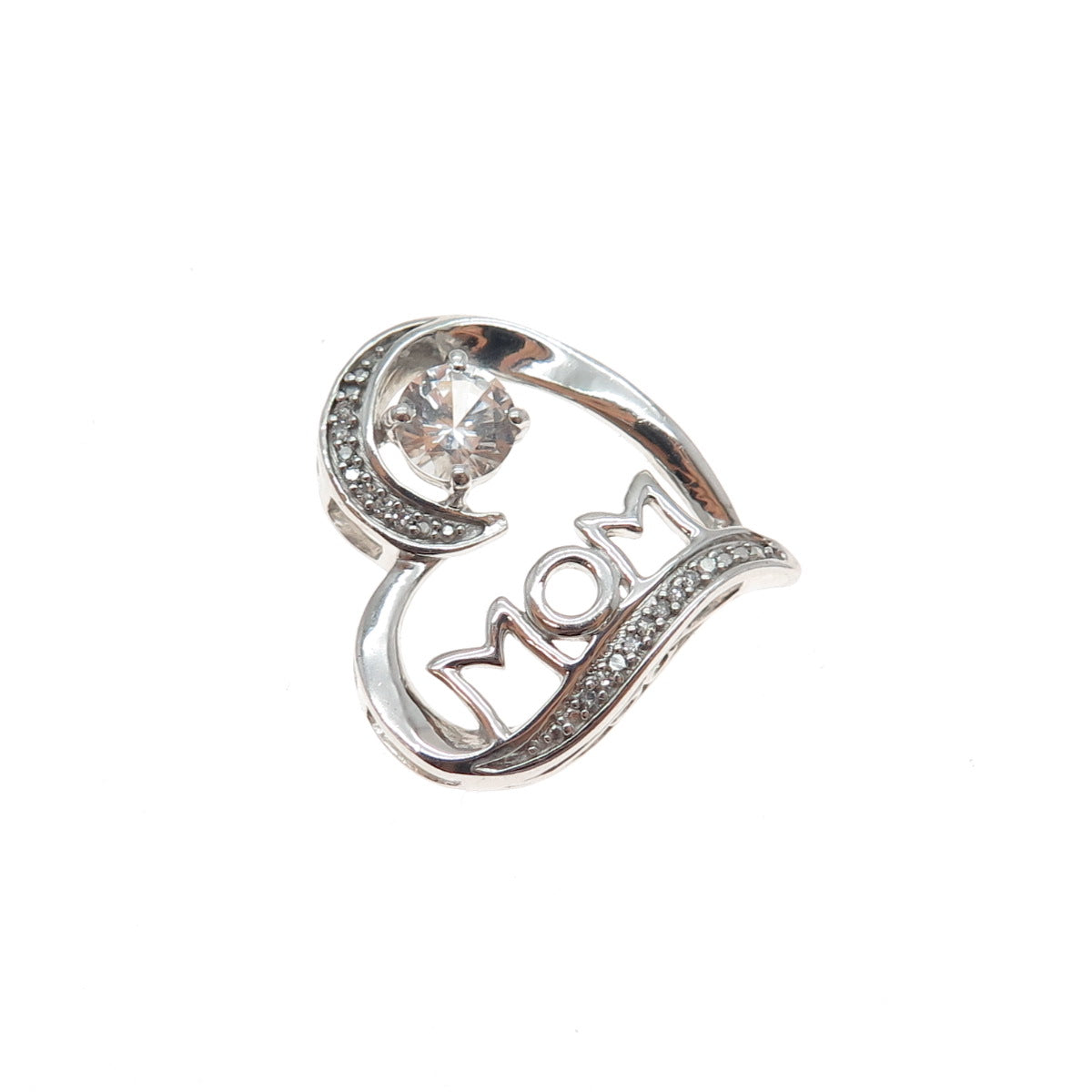 925 Sterling Silver Real Round-Cut Diamond & White Topaz Mom Heart Slide Pendant