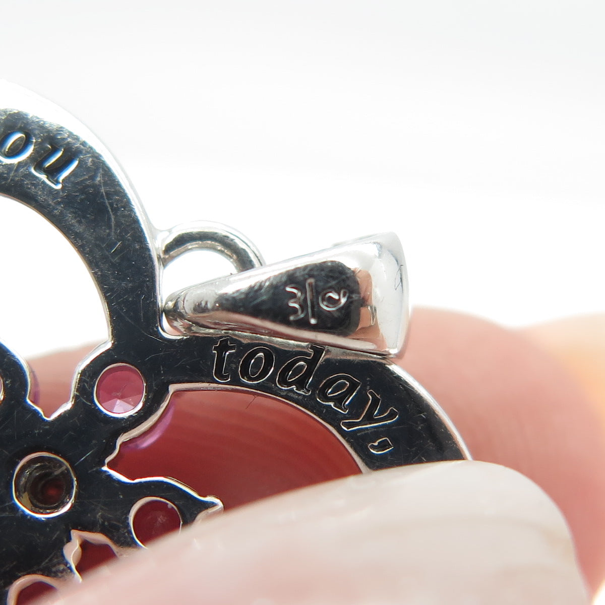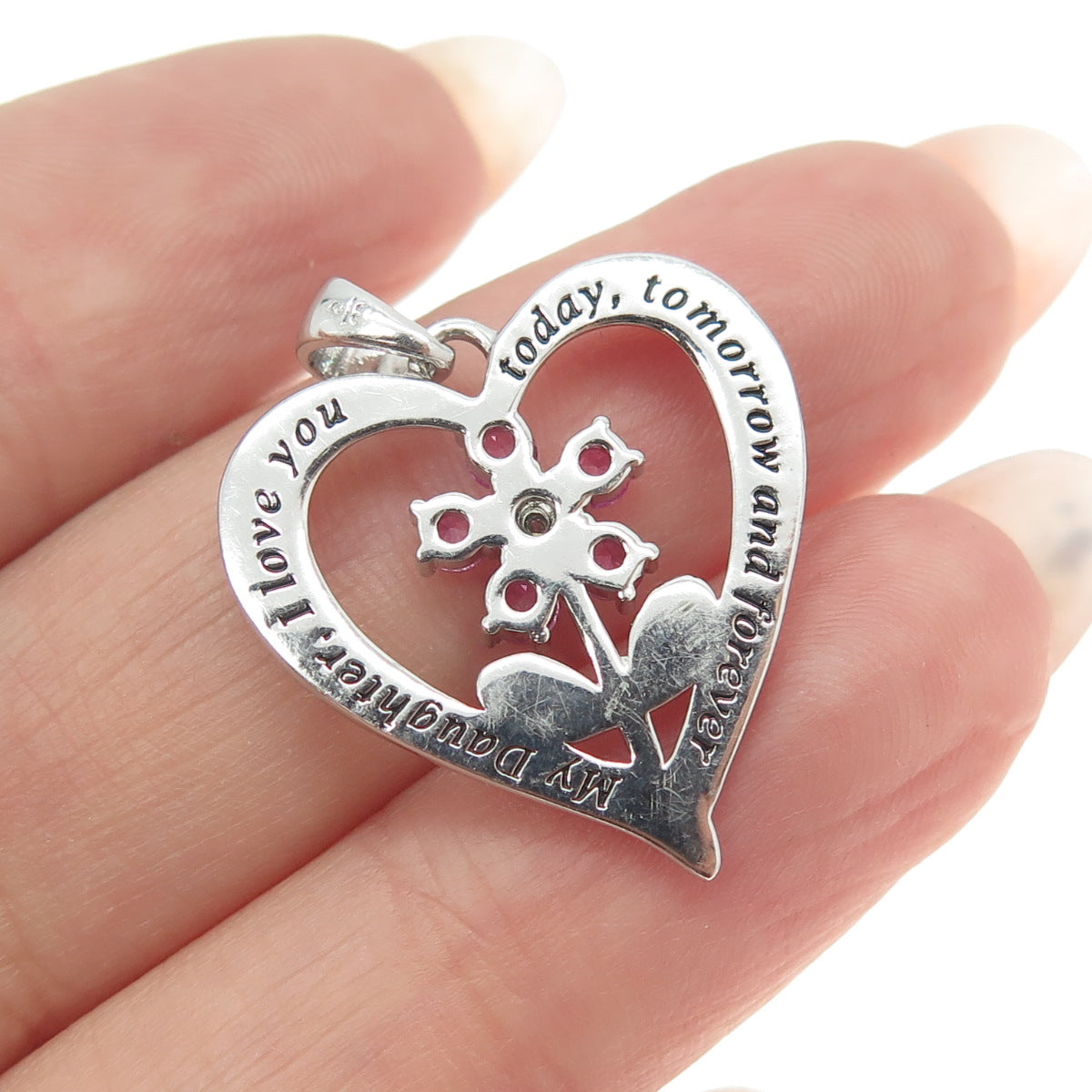 925 Sterling Silver Real White Diamond & Pink Sapphire Gem Heart Floral Pendant
