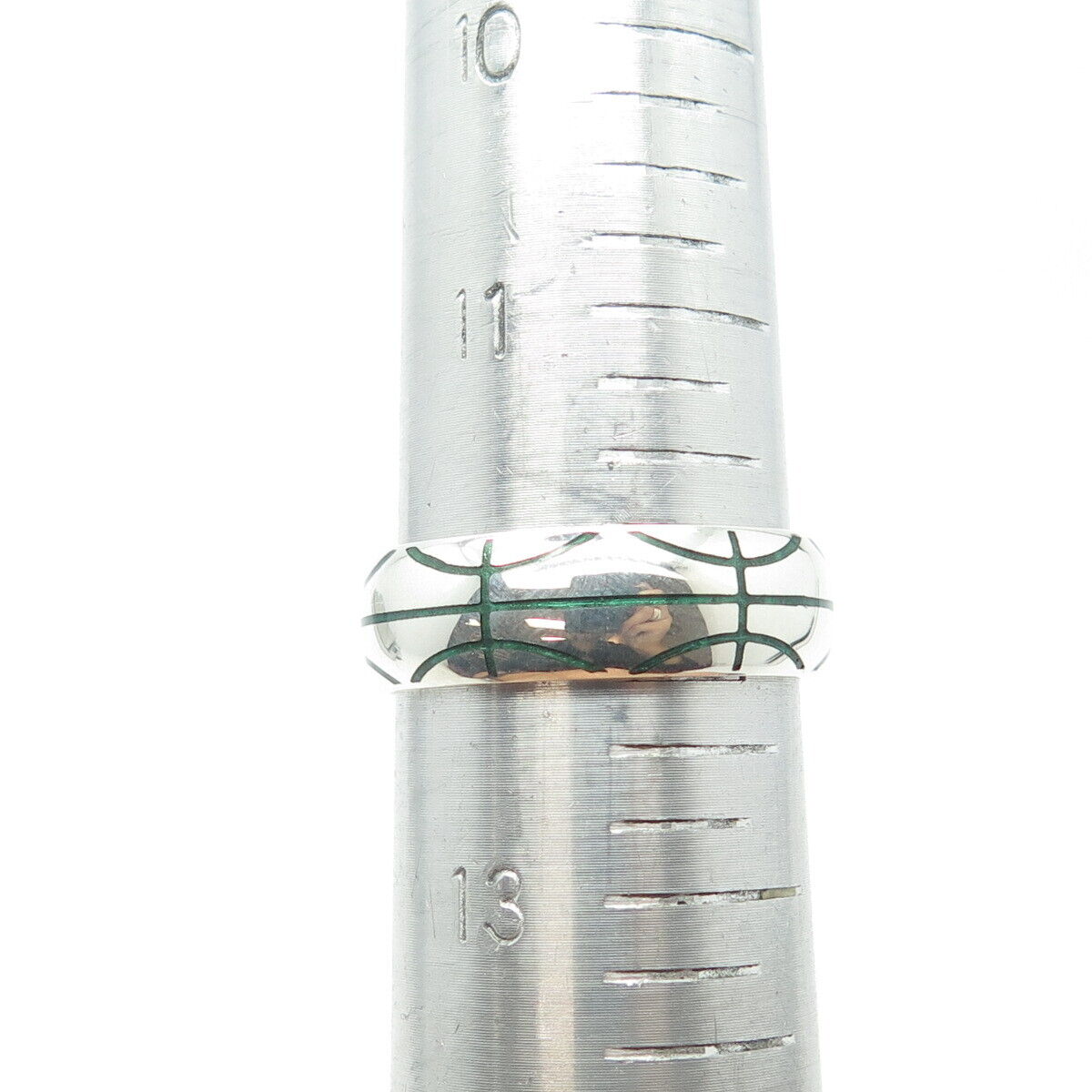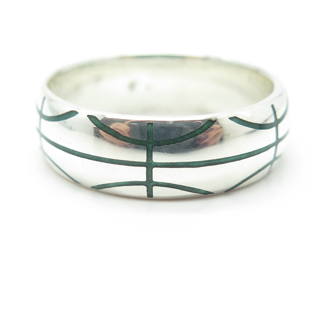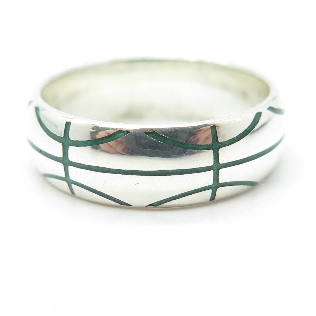 925 Sterling Silver Vintage Green Enamel Tribal Band Ring Size 12.25