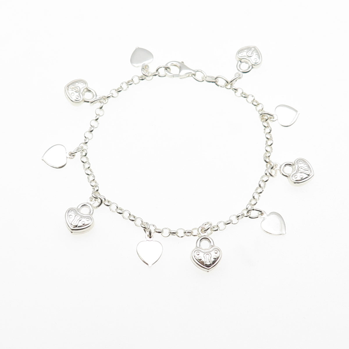 925 Sterling Silver Vintage Italy Heart Lock Dangle Charm Bracelet 6.75"