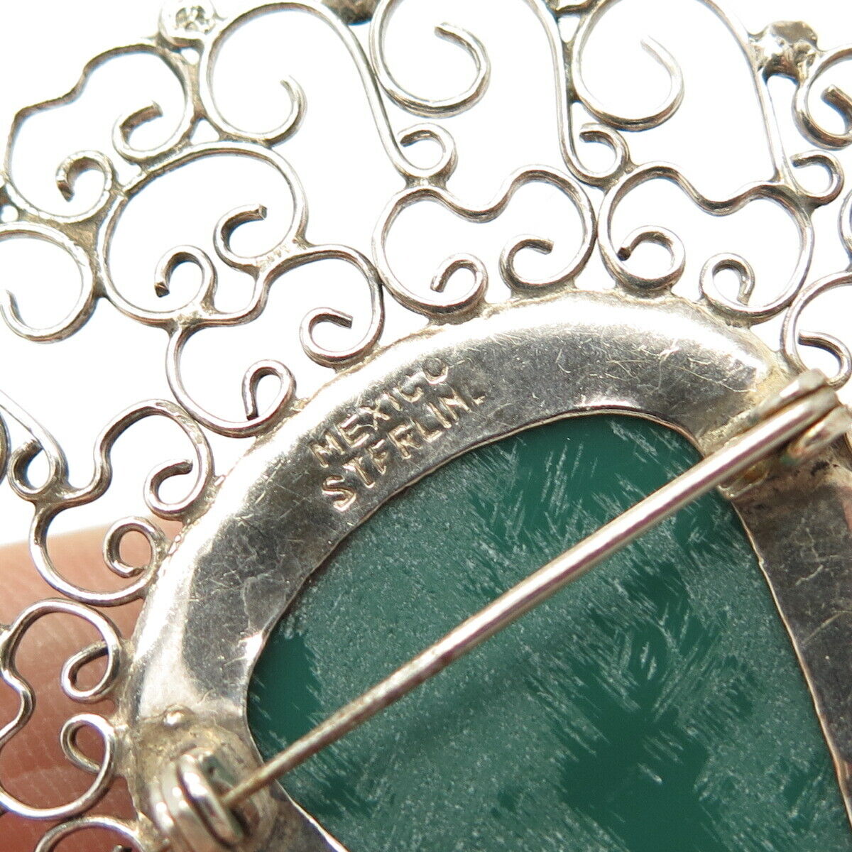 925 Sterling Silver Vintage Mexico Real Green Onyx Gem Tribal God Pin Brooch