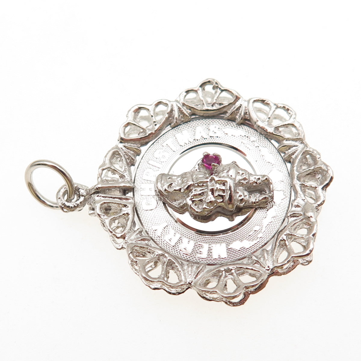 925 Sterling Silver Vintage Pink Rhinestone Merry Christmas Santa Charm Pendant